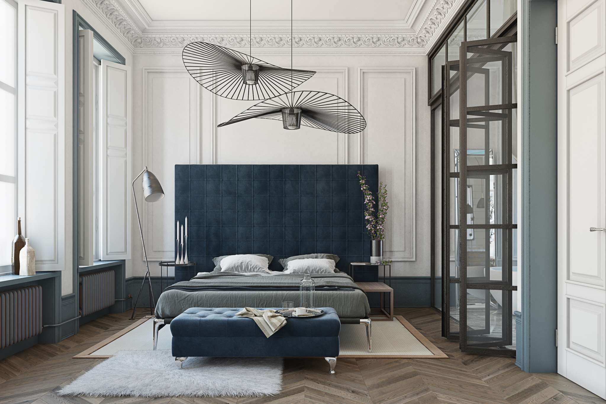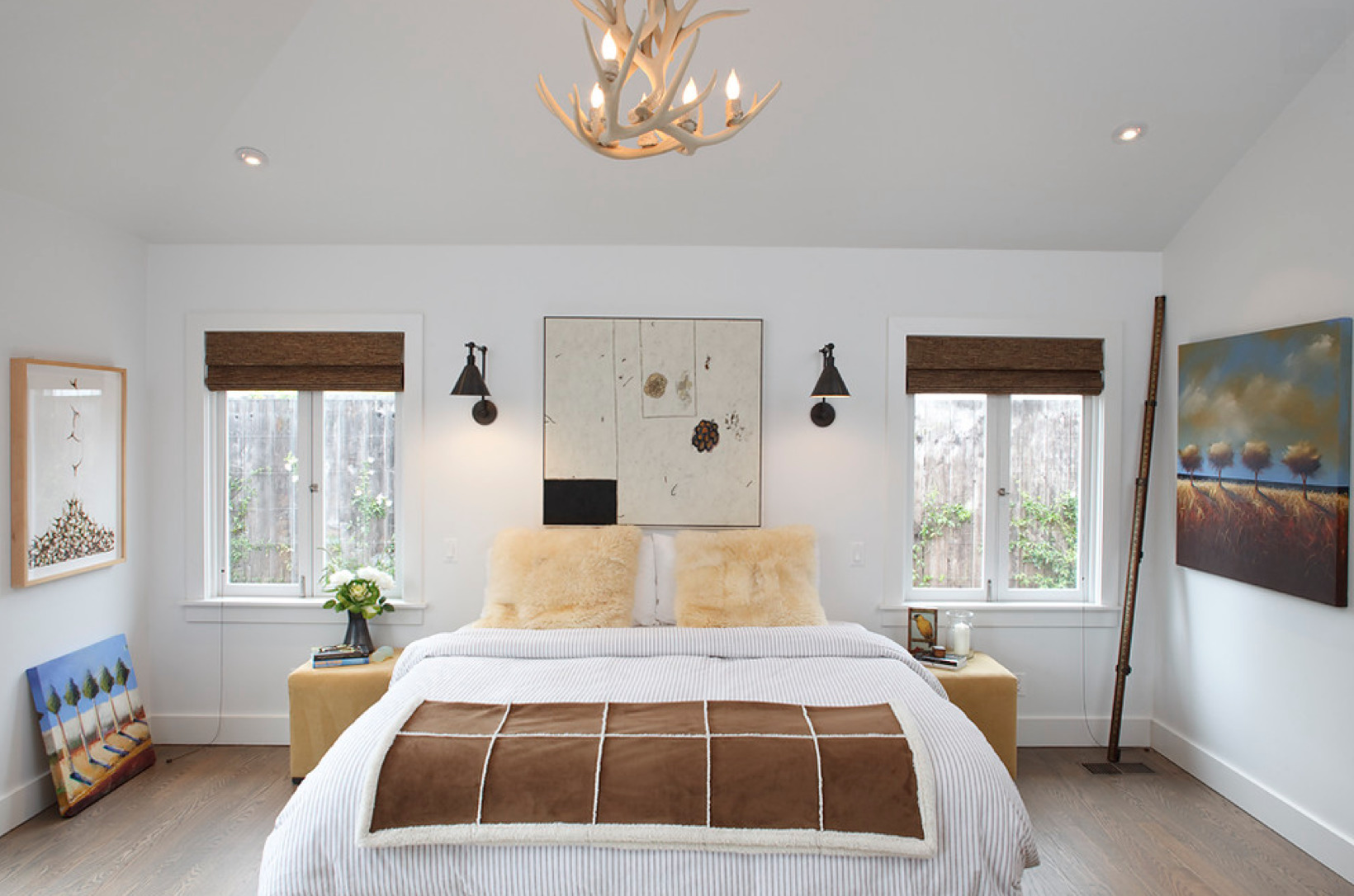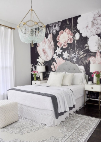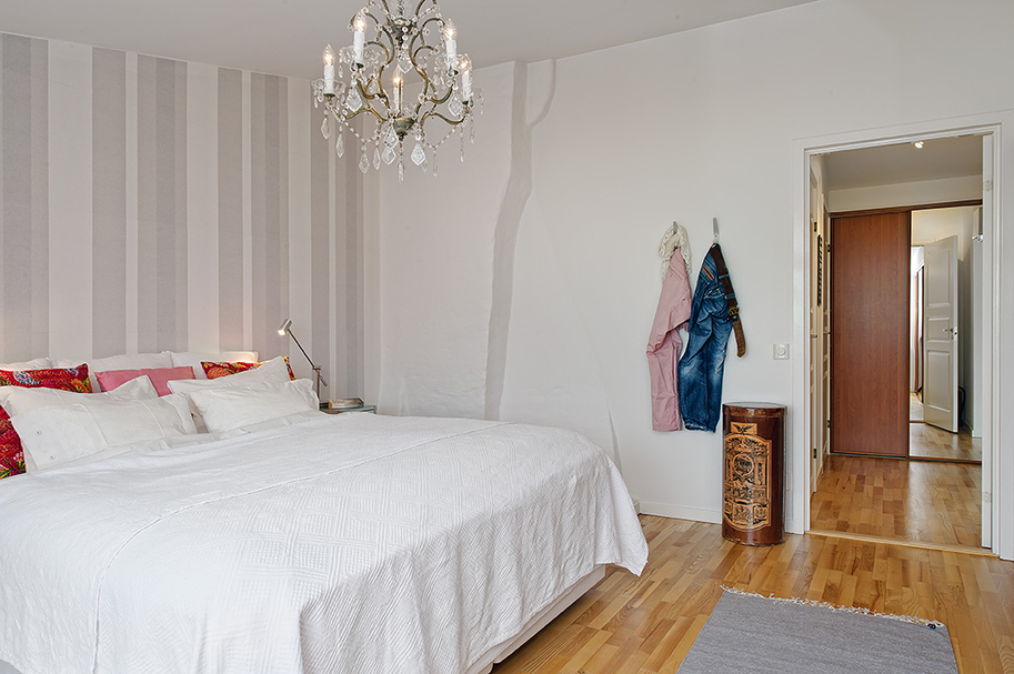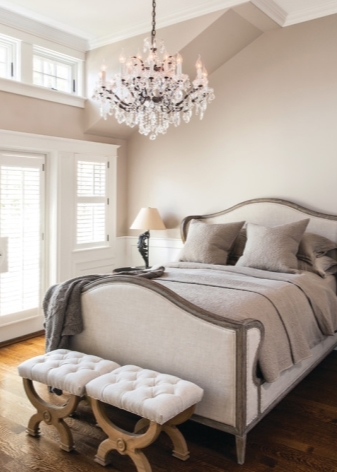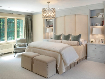 Der klassische Standort des Kronleuchters ist in der Mitte des Raumes, aber im Schlafzimmer ist es angebracht, ihn direkt über dem Trittbrett zu platzieren. Wenn der Kronleuchter hell genug ist, brauchen Sie vielleicht keine Lampe zum Lesen.
