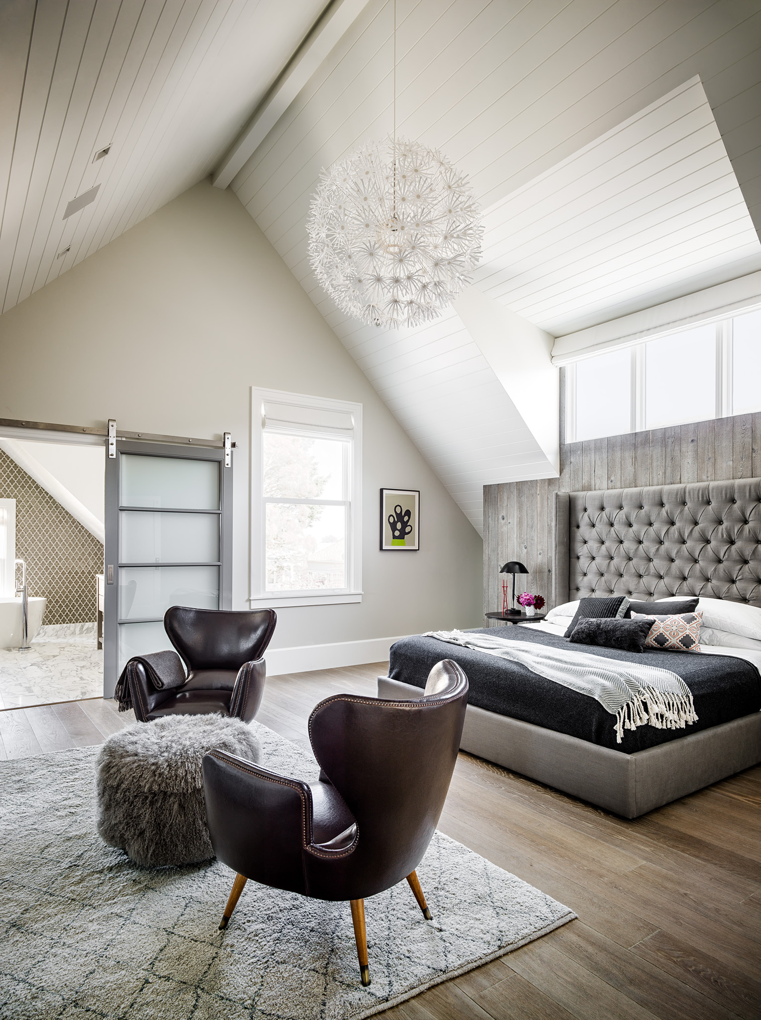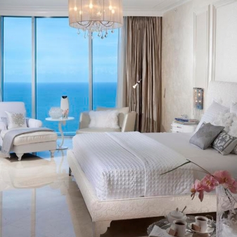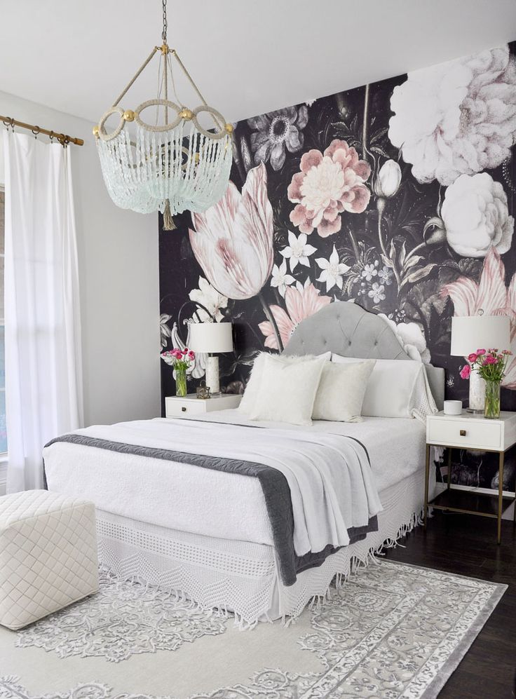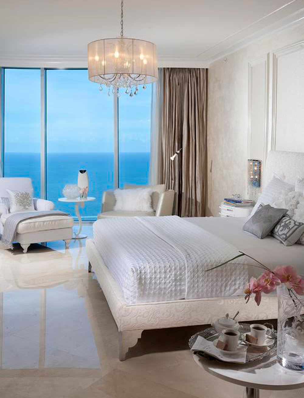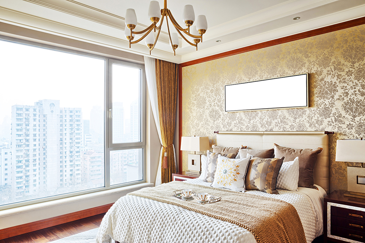 Der klassische Standort des Kronleuchters ist in der Mitte des Raumes, aber im Schlafzimmer ist es angebracht, ihn direkt über dem Trittbrett zu platzieren. Wenn der Kronleuchter hell genug ist, brauchen Sie vielleicht keine Lampe zum Lesen.