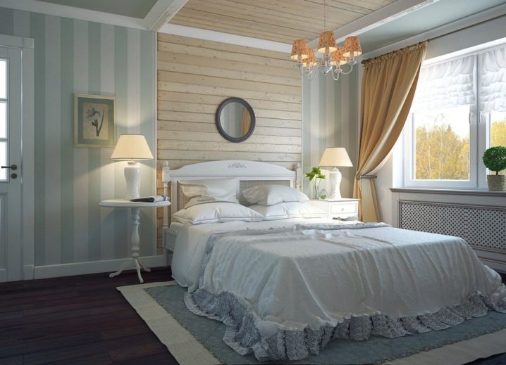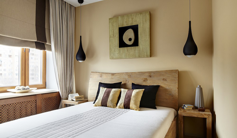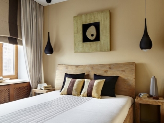 Pendelleuchten müssen nicht unter der Decke platziert werden. Wenn sie nicht die Funktion der Hauptbeleuchtung übernehmen, können Sie die Stehlampen auf den Nachttischen ersetzen und so eine diffuse Beleuchtung im Bereich des Bettkopfes erzeugen.