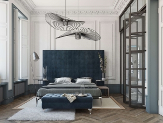 Ein Stofflampenschirm über dem Kristallkronleuchter überrascht niemanden, aber der Empfang wird nicht schlechter.Ungewöhnliches Umgebungslicht, das durch dieses Design erzeugt wird, erfordert zusätzliche Befestigungen (Pendelleuchte oder Punkt). Der Hauptleuchter befindet sich immer über dem Bett, als ob er auf den Hauptbestandteil des gesamten Innenraums zeigen würde.