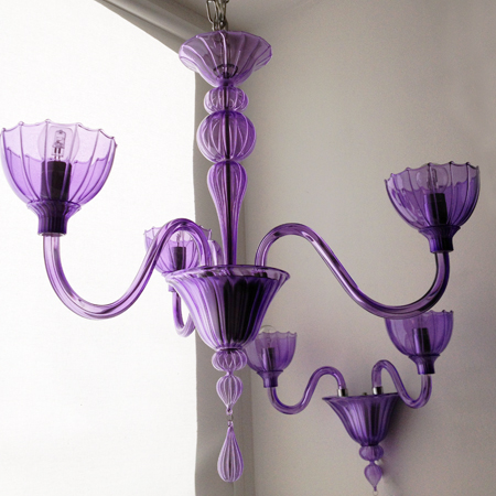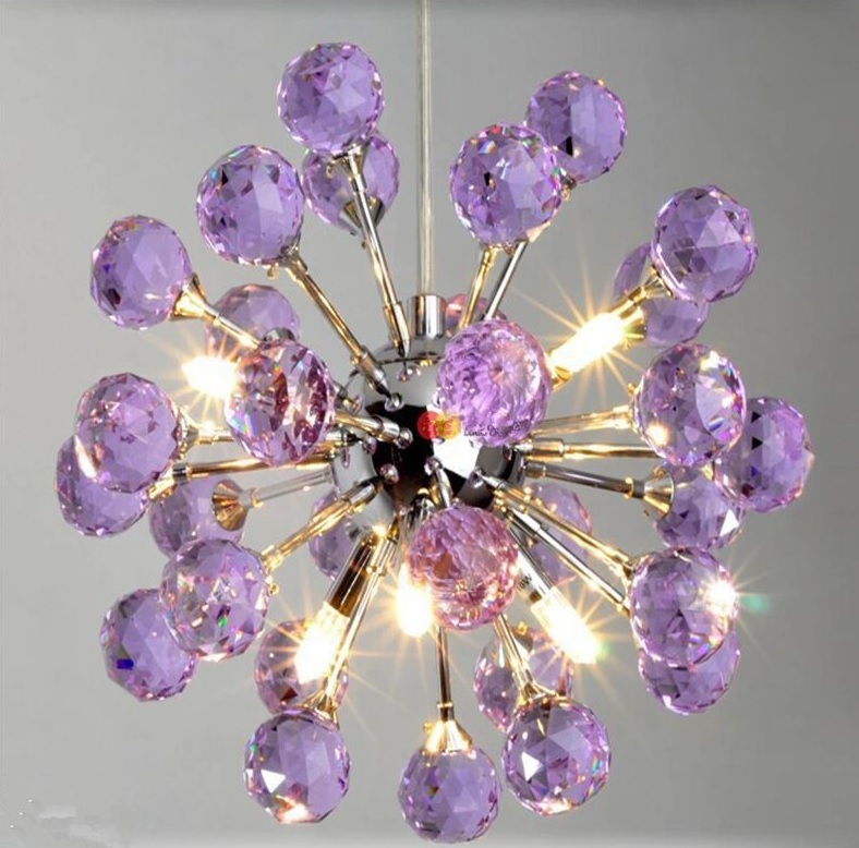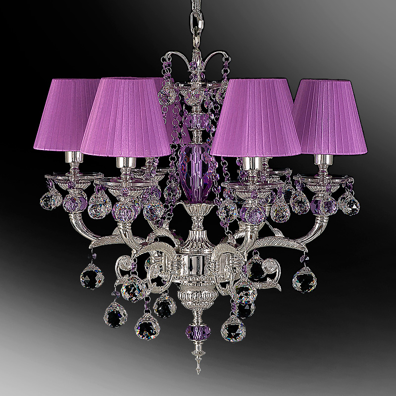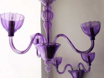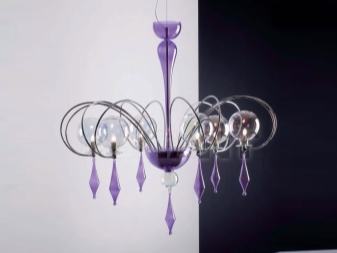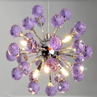 - Lila Kronleuchter sieht ungewöhnlich aus und wirkt oft als Farbakzent. Violette Farbe wird hauptsächlich in kombinierten Schlafzimmerbüros verwendet, da sie die Leistung des Gehirns stimuliert.