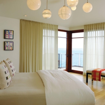 - Für Schlafzimmer mit Stil Minimalismus Sie können einen einzigen Lampenschirm aus Stoff und die Milchglasdecke wählen. Markante Merkmale sind das Fehlen von Mustern, die geometrische Genauigkeit von Formen, die Wahl der Farben im Schwarz-Weiß-Spektrum. Die Basis muss aus Holz oder einer einzelnen Schnur sein, im zweiten Fall lohnt es sich, die Schnur so unauffällig wie möglich zu machen.