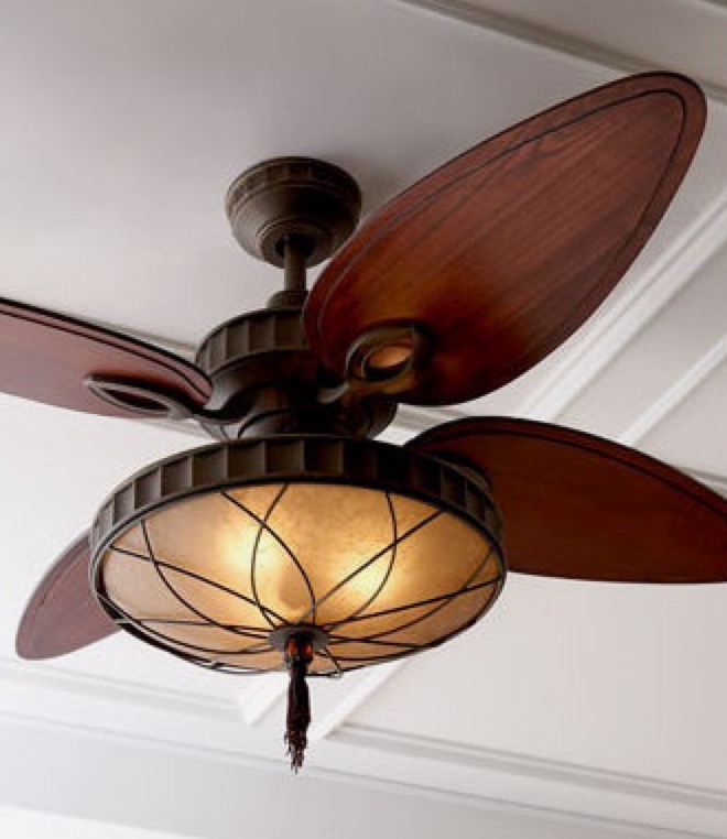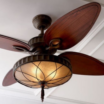 Das luftig geschmiedete Modell mit Stoffschirmen fügt sich perfekt in das klassische Interieur und den außergewöhnlichen Kronleuchter-Fan - in den industriellen ein.