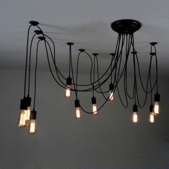 - Schlafzimmer im modernen Stil Loft Erfordert die Installation eines ungewöhnlichen Kronleuchters. Dies könnte ein interessantes "Spinnen" -Design sein, das Ihnen erlaubt, den größten Raum zu beleuchten, oder ein Bündel von mehreren Edison-Glühbirnen, die ohne die Verwendung von Deckenlampen aufgehängt sind. Für lange enge Schlafzimmer ist es angebracht, Spurkronleuchter zu verwenden.