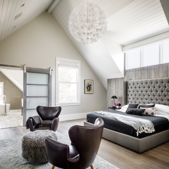 Trotz der Tatsache, dass viele Designer die Verwendung von großen Lampen auf schrägen Decken zu entmutigen, scheint im Inneren dieses Schlafzimmers Lampenschirm-Löwenzahn mehr als angemessen. Es ist nicht direkt in der Mitte des Raumes installiert, sondern näher an der Ruhezone im selben Raum.