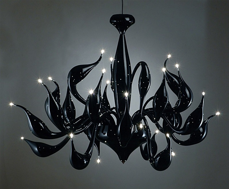 - Ein schwarzer Kronleuchter ist eine ziemlich kühne Wahl. Grundsätzlich wird Schwarz als Hauptfarbe im Herrenschlafzimmer-Stil "Loft" gewählt. Sie können einen schwarzen Lampenschirm wählen, gerade genug, um eine helle Glühbirne aufzuheben. Der transparente Kristall-Kronleuchter im schwarzen Stoffzylinder wirkt ungewöhnlich.