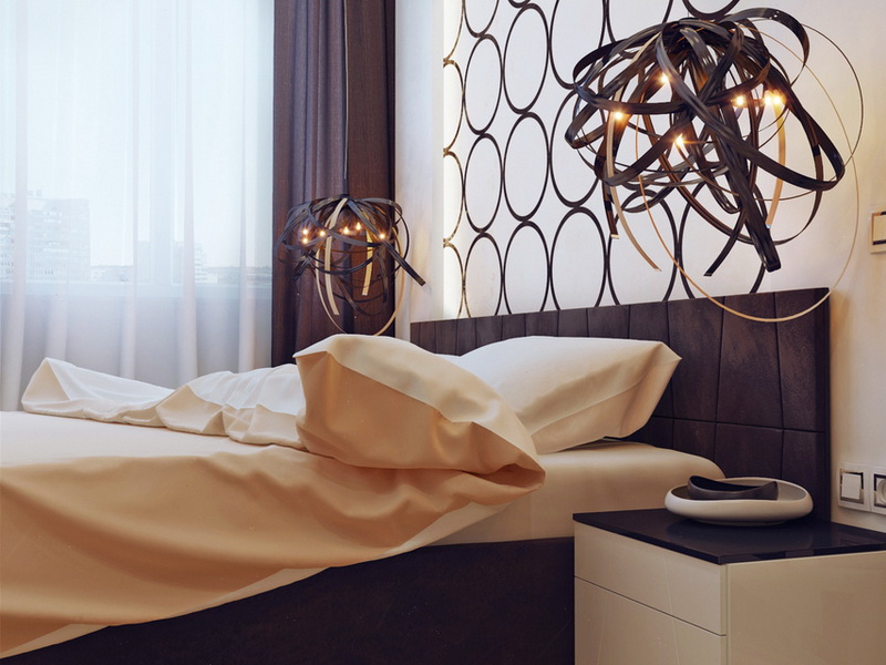 Die Schlafzimmer begrüßen die Verwendung von Kronleuchtern nicht nur im klassischen Sinne. Solch ein Kranz ist perfekt für einen Raum in einem modernen Stil, der als heller Akzent wirkt. Besonderes Augenmerk sollte auf die Auswahl der Farben gelegt werden: Bronzemontierungen und Rahmen wiederholen exakt die Schattierungen der Umgebung.