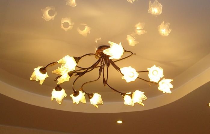 - Für mehrschichtige Gipskartondecken Sie müssen nicht so sehr einen hellen Kronleuchter wählen, als für das gesamte Interieur geeignet. Der Mangel an Beleuchtung kann leicht durch Hinzufügen von Wandlampen, Strahlern oder LED-Beleuchtung kompensiert werden. Achten Sie darauf, dass schwere Konstruktionen nicht für Gipskartondecken geeignet sind: Es besteht die Gefahr, dass ein solcher Kronleuchter zusammen mit den Decken einstürzt.