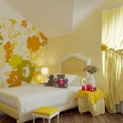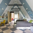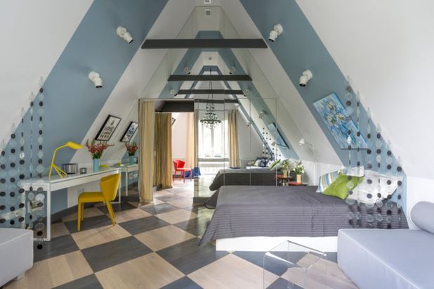 - Helle Farben. Sehr saftig und malerisch Schlafzimmer auf dem Dachboden.Gesättigte Farben im Innenraum lassen Sie in den Geist des Feierns und Spaßes eintauchen, und die originale Dekoration an den Wänden und die thematischen Lampen in Form von Ballons verleihen dem Raum Farbigkeit und Geschmack.