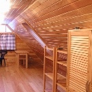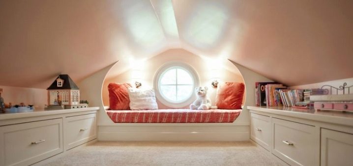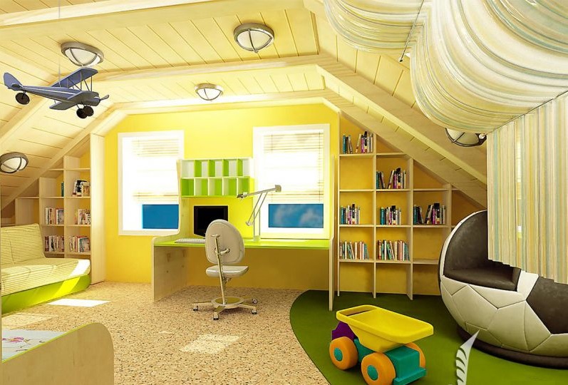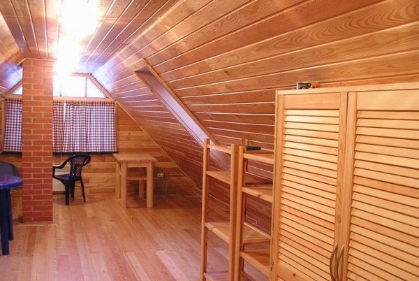 - Ein weiterer unbestrittener Vorteil ist die Kältebeständigkeit des Raumes mit Holzdecken und ein hoher Schutz vor Niederschlägen. Der Komfort und die Sicherheit des Kindes ist das Wichtigste, und ein Raum in einem solchen Dachboden kann sie leicht bereitstellen.