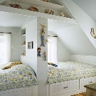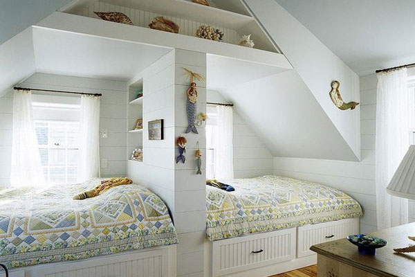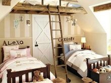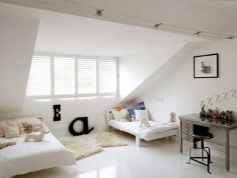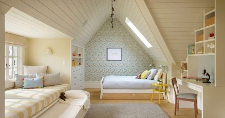 Die Gestaltung des Raumes im Dachgeschoss bestimmt bereits bestimmte Bedingungen bei der Möbelauswahl. Wenn Sie ein Zimmer für zwei Kinder schaffen, dann wird es aufgrund der Struktur der Wände und der Decke nicht immer möglich sein, hohe Schränke für Kleidung oder Etagenbetten zu wählen. Dieses Problem ist jedoch leicht zu lösen. So kann ein großer Kleiderschrank eine Kommode oder Wandschränke leicht ersetzen.