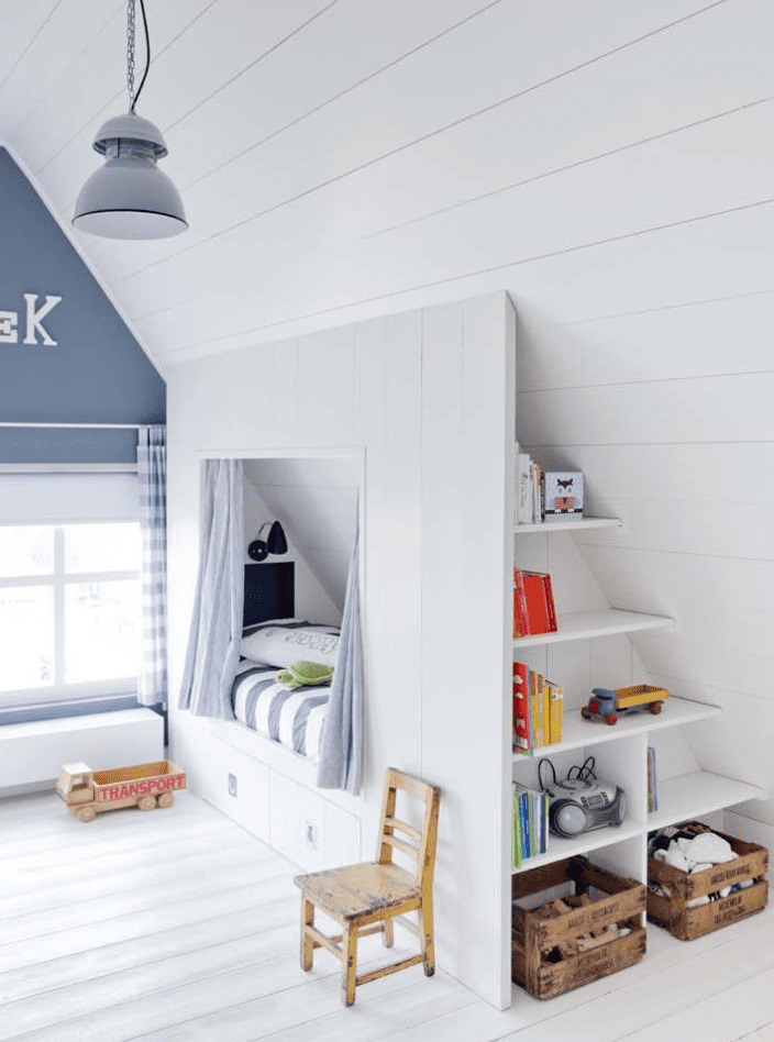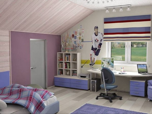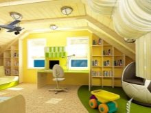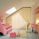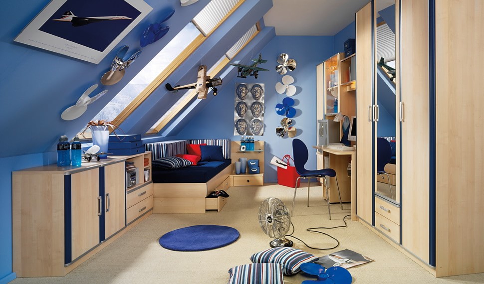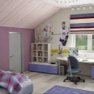Wenn Sie einen Raum planen, müssen Sie ihn in geeignete Zonen unterteilen. Bei einem Kind lohnt es sich, eine Zone zum Schlafen, Studieren und Spielen einzurichten. Selbst wenn das Zimmer im Dachgeschoss nicht geräumig genug ist, muss das Zimmer ein Bett, einen Arbeitstisch, einen Kleiderschrank für die Aufbewahrung von Kleidung und Schubladen (oder Nachttische) für Spielzeug enthalten. Am Eingang zum Zimmer ist es am besten, einen Schrank und ein Regal mit Schuhen zu stellen.