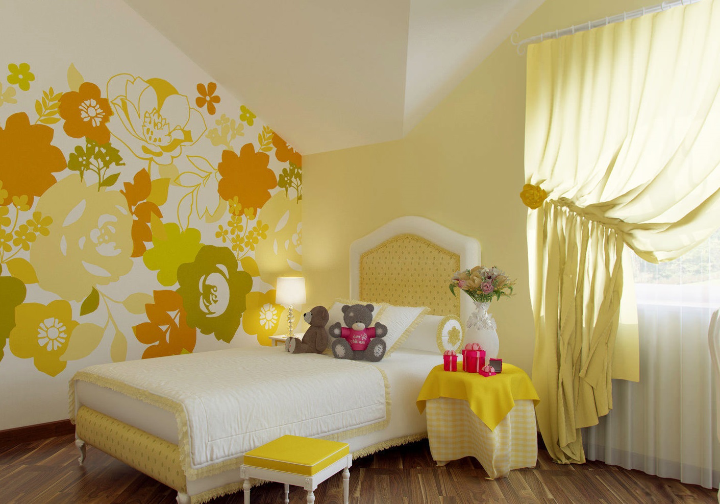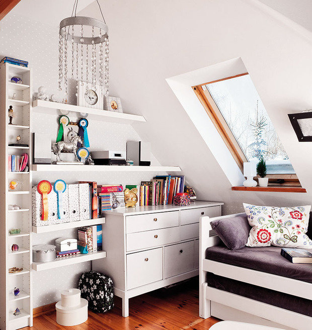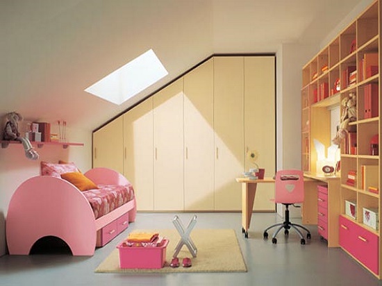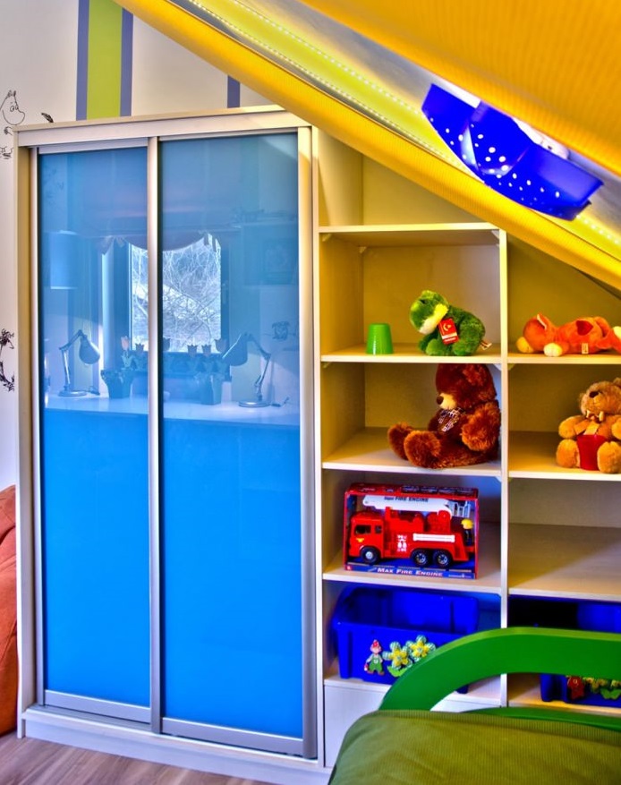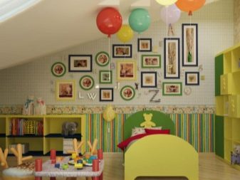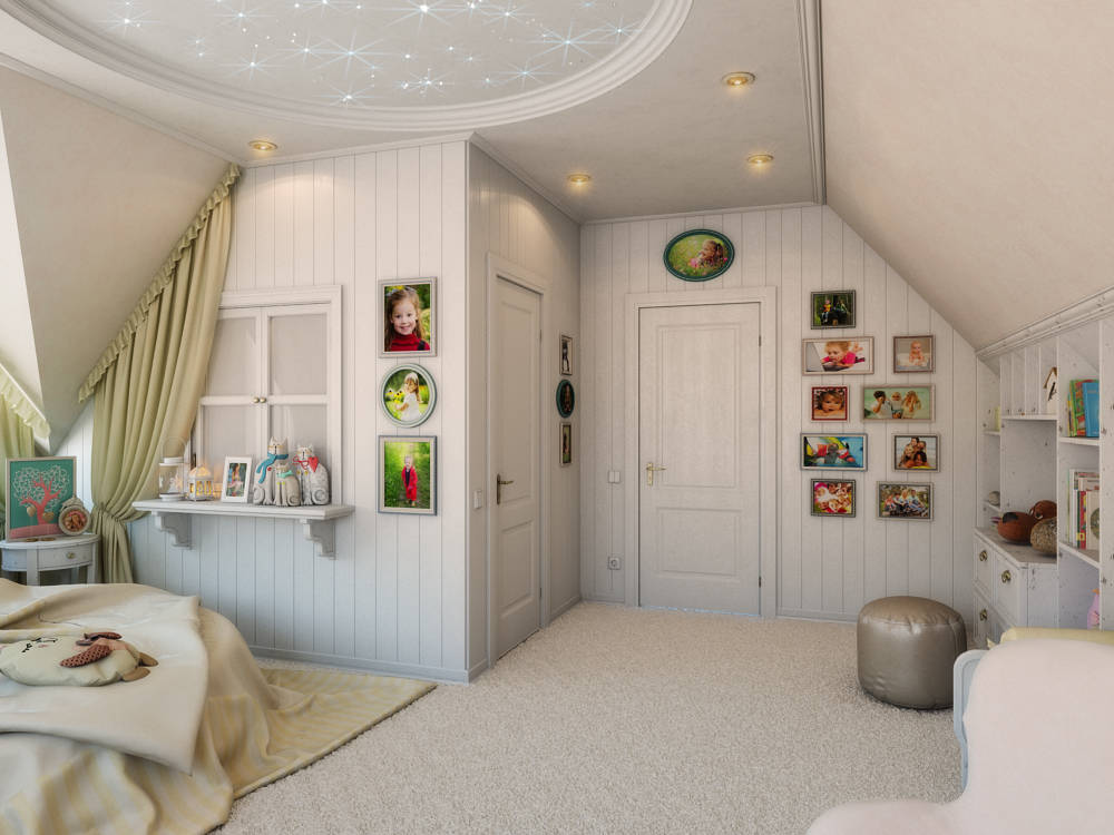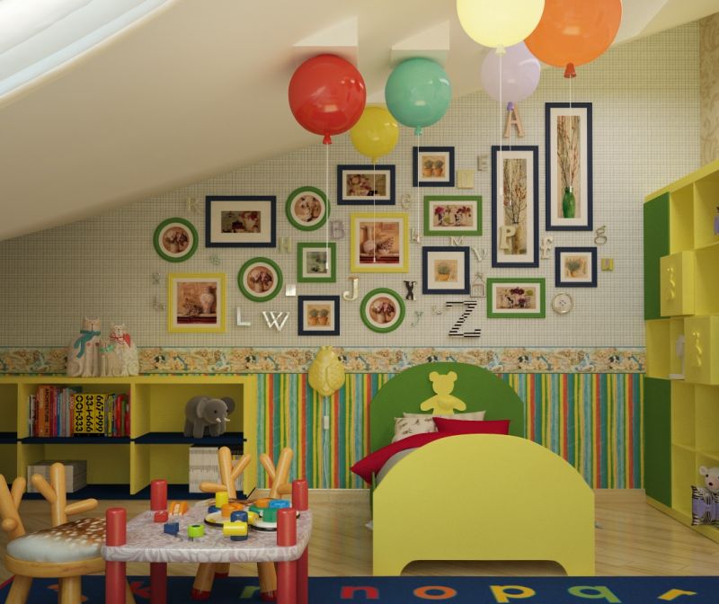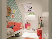 Kinder lieben es, etwas einzigartiges und farbenfrohes zu haben, daher sollte das Dekor ihres Schlafzimmers angemessen sein. Abgeschrägte Wände können mit Bildern eines Kindes in Rahmen verziert werden, eine Collage mit seinen Fotos, spezielle Wandzeichnungen: beginnend mit den Abdrücken von Kinderpalmen und endend mit Zweigen der blühenden Sakura. Selbst die einfachsten Dinge (wie ein Bett) können zu etwas fabelhaftem und einzigartigem gemacht werden.