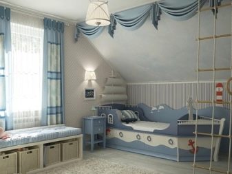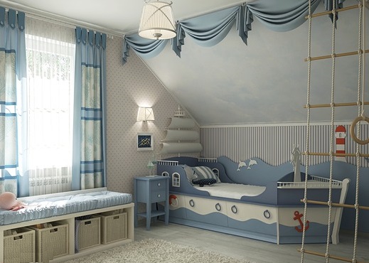 Wenn es die Deckenhöhe zulässt, wäre es eine gute Lösung, sie im Raum des Wandgymnastik-Komplexes anzuordnen. Einige hölzerne Leitern sind eine ausgezeichnete Lösung, zum Beispiel für ein Zimmer im nautischen Stil. Solche Leitern werden dem Kind erlauben, sich wie ein furchtloser Kapitän des Schiffes zu fühlen.