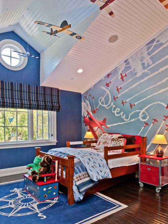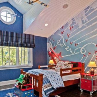 Im Raum für den Jungen zeichnet sich das Design durch blaue, blaue und grüne Farben aus. Kann Marine oder Sport Themen verwendet werden. Bei der Planung eines Schlafzimmers für zwei Kinder kommt die Entscheidung, den Raum mit Hilfe von Farbzonen zu teilen, zur Rettung, die jedem Kind eine Ecke bietet, in der Sie Zeit mit Vergnügen verbringen können.