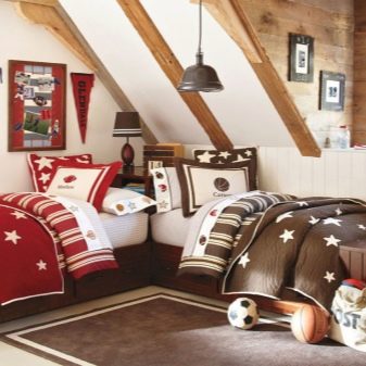 - Sportgeist. Das Schlafzimmer im Dachgeschoss für zwei Kinder ist in einem angenehmen warmen Farbschema gehalten, die Verwendung von Holz im Inneren verleiht dem Raum einen besonderen Komfort. Die Einrichtung ist ein Sportthema.