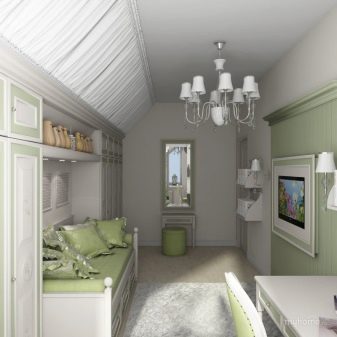 - Utopie grün. Schlafzimmer für ein junges Mädchen. Die angenehme Kombination von blassem Grün und Weiß, eine bequeme Anordnung der Möbel, platzsparend und eine klare Aufteilung des Raumes in Zonen machen den Raum zu einem echten Traum.
