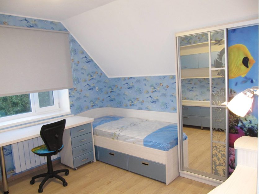 - Meeresmotive. Dieses Foto zeigt ein schönes Schlafzimmer für einen Jungen, im maritimen Stil gemacht. Blaue Tapeten mit dem Bild von Fisch an den Wänden sind in perfekter Harmonie mit dem Schrank im gleichen Stil. Besonders erfolgreich ist die Wahl der Möbelfarbe, die eine Atmosphäre von sommerlicher Frische und Leichtigkeit schafft.