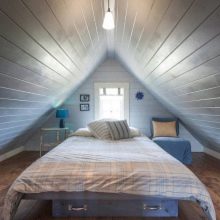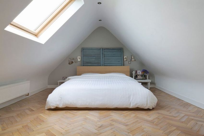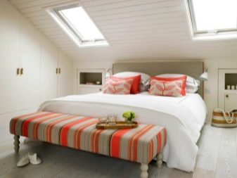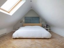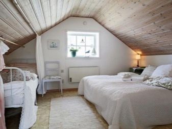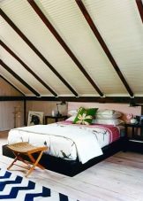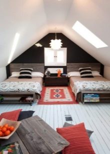 Wenn Sie ein Schlafzimmer auf dem Dachboden machen, ist es rational, Betten in Bereichen mit einer schrägen Decke zu installieren, dies spart ein wenig Platz.