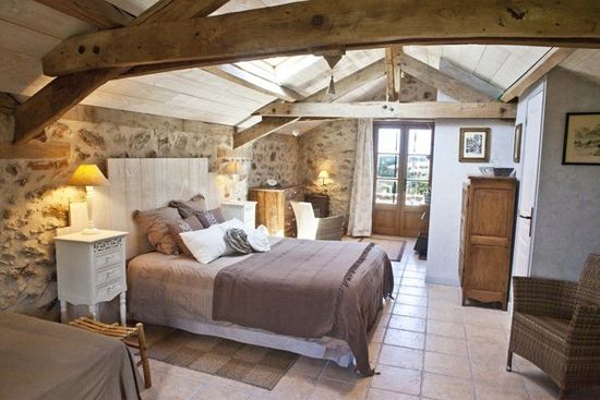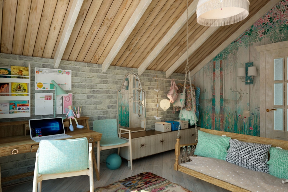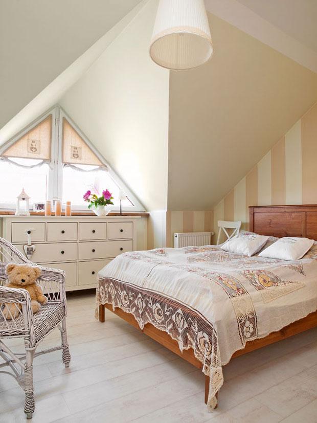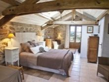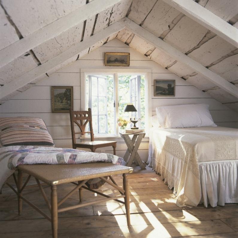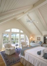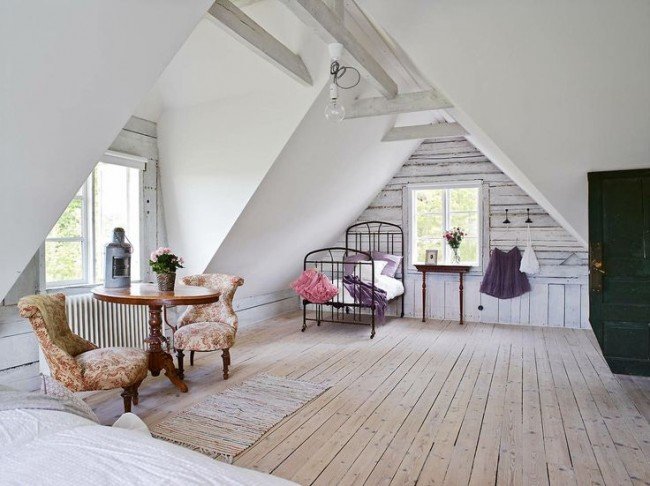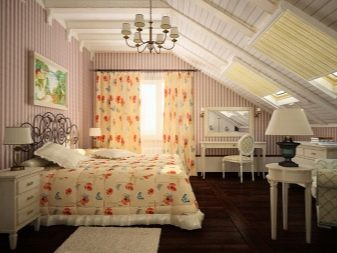 - Wenn Sie im Stil Stil wählen Land oder Provence Dann stoppen Sie Ihre Wahl auf der natürlichen Beschaffenheit des Holzes. Sie können die Oberfläche in warmen Brauntönen anmalen oder das Holz mit einem schützenden Klarlack überziehen. Und wenn Sie einen Baum in Weiß malen, können Sie den Raum unter dem Dach optisch erweitern. Auch diese Designtechnik konzentriert sich auf die originalen Möbel und Textilien.