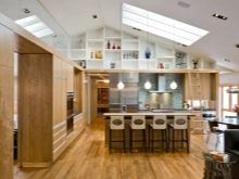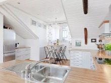 Falls gewünscht, können Sie entwerfen und die Bar, die effektiv die Mini-Küche auf der Kochzone und Fläche für Mahlzeiten teilen. Dieses Layout ist besonders relevant, wenn das Haus einen sehr schiefen Giebel oder Walmdach hat. Und für diejenigen, die mit Freunden bei einem Glas Wein sitzen mögen, können empfohlen werden, den Dachboden zu machen, ist nicht nur eine Küche, sondern ein echter Verkostungsraum mit Weinschrank. Was braucht es noch für entspannte Treffen und Gespräche "nach Mitternacht"?