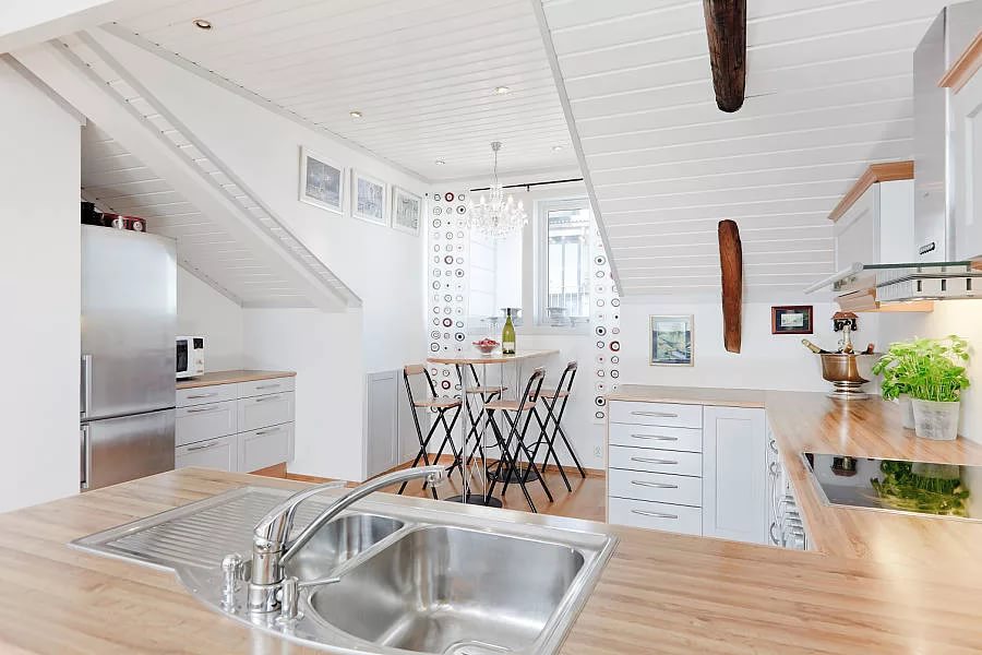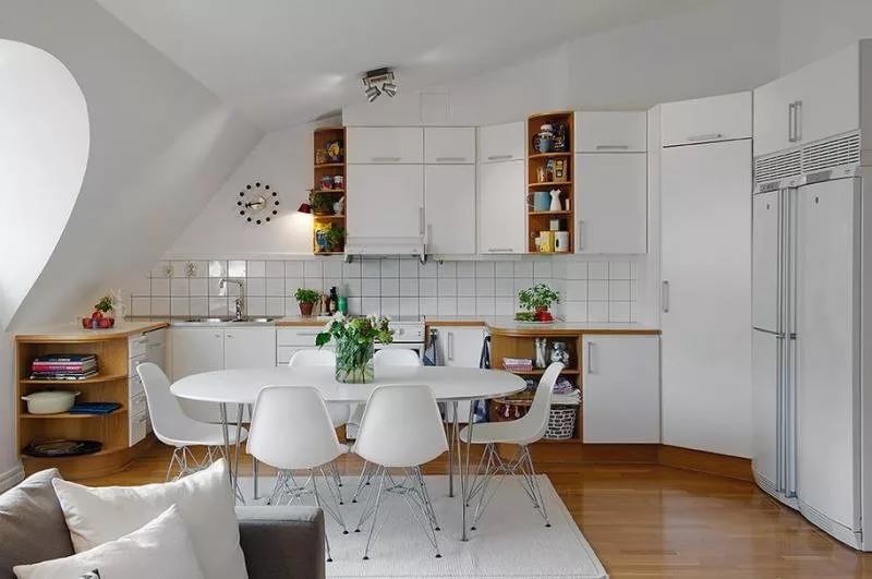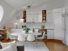 - Ein Beispiel für die Überarbeitung eines Dachbodens in die Küche ist komplexer und kostspieliger, wenn der Raum die erforderliche Kommunikation und gute Belüftung zusammenfasst. Es ist wünschenswert, dass die Arbeiten an den notwendigen technischen Systemen in der Bauphase durchgeführt wurden. Dann ist es durchaus möglich, sogar eine Küche-Esszimmer unter dem Dach zu platzieren. Die Hauptsache in einem solchen Raum ist die korrekte Verteilung von Funktionszonen. Platte und ein Schneidetisch können an der Wand gestellt werden, und in der Mitte oder in der Nähe der Fenster bieten Platz für einen großen Esstisch.