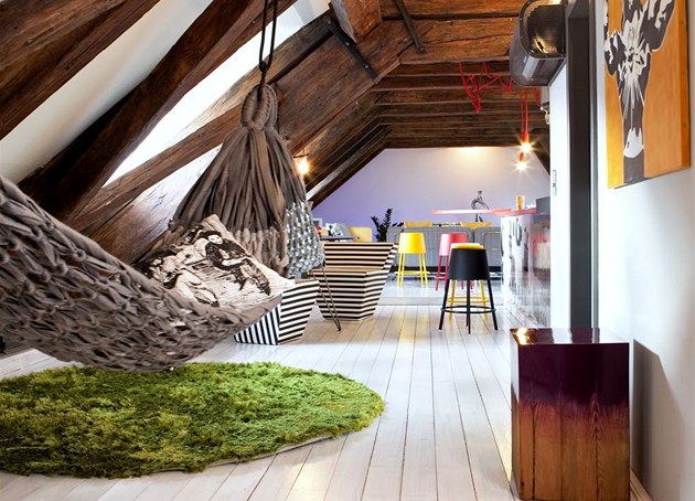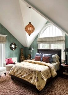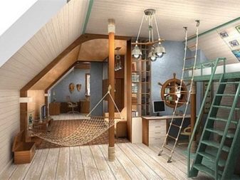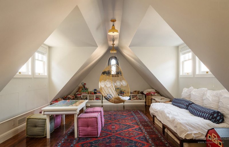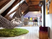 Um die Asymmetrie des Dachbodens zu mildern und das ohnehin schon vorhandene Minimum an freiem Raum nicht zu "stehlen", Versuchen Sie, Möbel in Ecken oder in der Nähe von Wänden zu platzieren. Eine optische Erhöhung der Höhe der Decken wird Ihnen helfen, eine Design-Rezeption mit vertikal länglichen Objekten im Inneren zu verwenden, zum Beispiel Spiegel, schmale Gemälde oder Vorhänge mit Streifen entlang dieser. Eine gemütliche Hängematte im Naherholungsgebiet wird die Atmosphäre des Dachzimmers noch romantischer machen. Für den Bau einer Hängematte können Sie die Stützpfeiler verwenden oder an den Wänden befestigen.