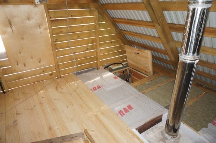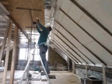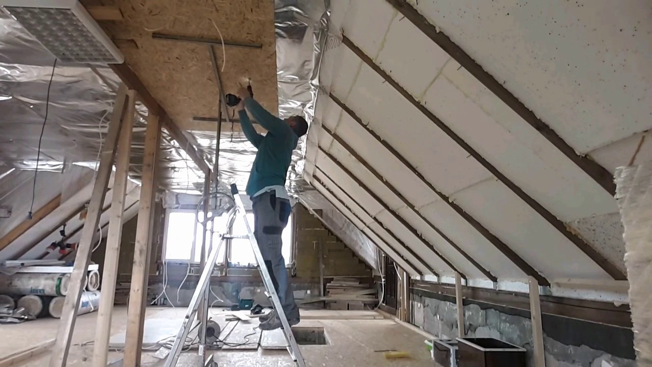 Wenn die Isolierung und die Dekoration des Dachbodens nach dem Bau des Hauses hergestellt werden, wird die Isolierung von innen gesäumt, und oben ist sie mit Gipskartonplatten oder Sperrholz bedeckt.