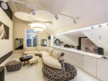 Die Organisation der Beleuchtung im Dachgeschoss trägt sowohl funktionale als auch dekorative Lasten.Da der Raum unter dem Dach geschlossen ist, ist es wichtig, die richtige Beleuchtung zu wählen, die die Dunkelheit für immer verbannt. Dies kann nicht nur mit Hilfe eines klassischen Kronleuchters oder Strahlers, sondern auch mit zusätzlichen Lichtquellen erfolgen. Diese können Stehlampen, Wandlampen, stationäre und rotierende Lampen um den Raum herum, Tischlampen, fluoreszierende Modelle usw. sein.