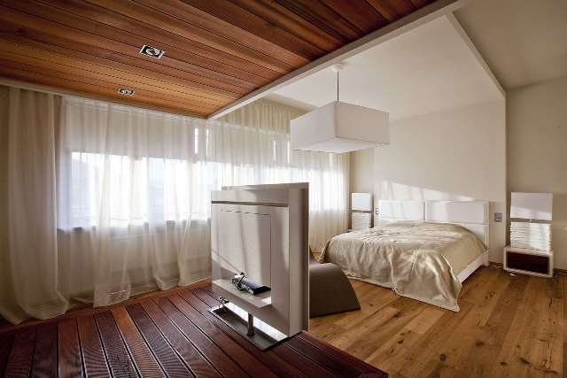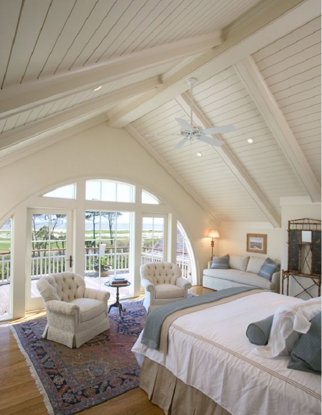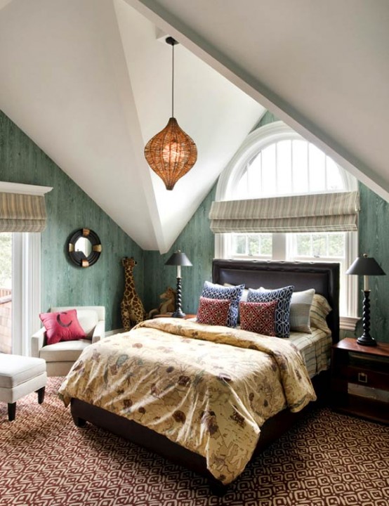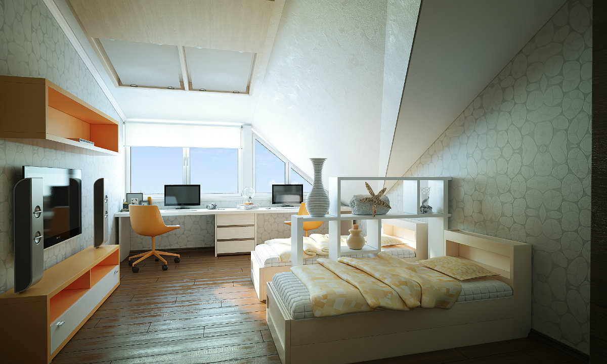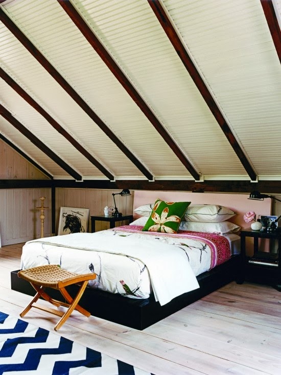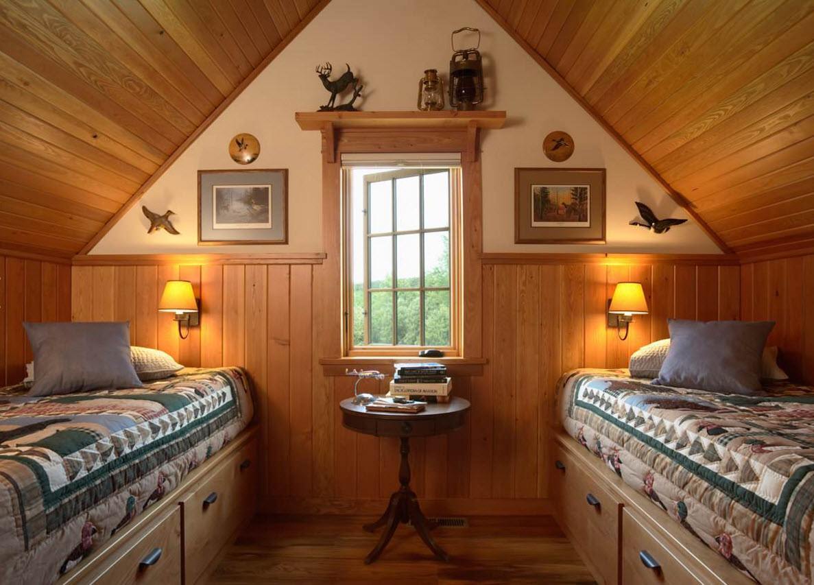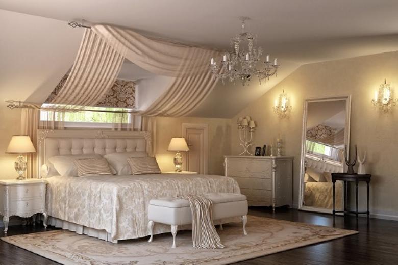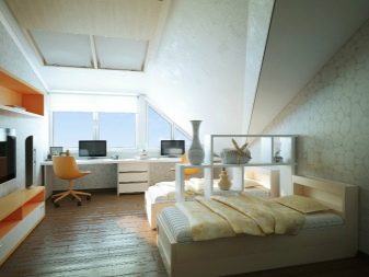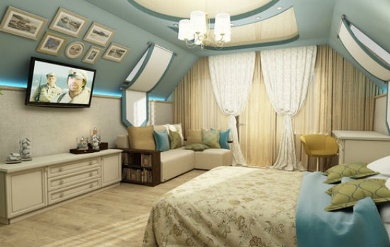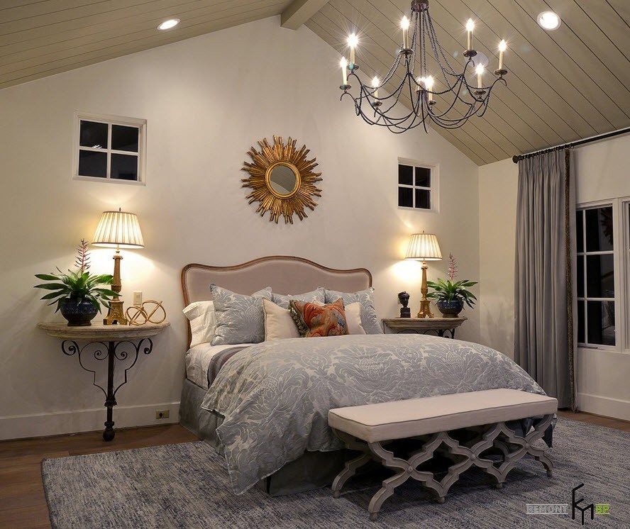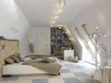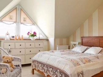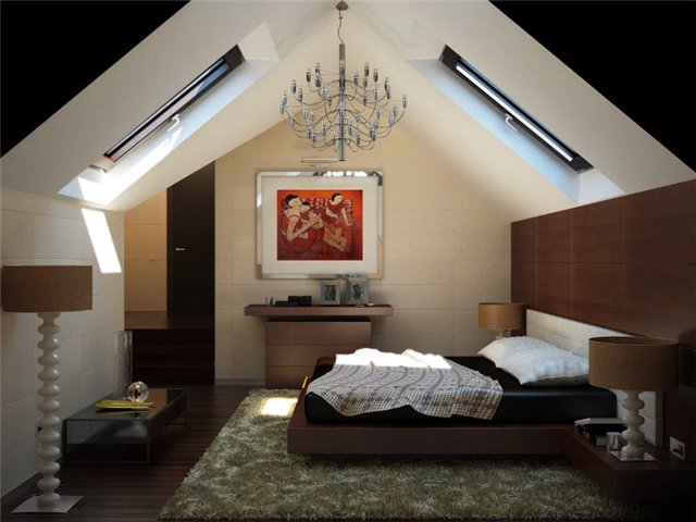 - Wie die Statistiken zeigen, bevorzugen die Mehrheit der Sommerbewohner und Eigentümer von Privathäusern zu arrangierendas Dachgeschoss in Form eines Schlafzimmers, ist es so gemütlich, unter dem Giebeldach einzuschlafen und aus den Strahlen der aufgehenden Sonne aufzuwachen, die durch das Fenster schlägt. Im Schlafzimmerraum liegt die meiste Zeit, so dass die nicht standardmäßige Höhe der Decken keine Schwierigkeiten und Probleme darstellt. Die Option mit einem Doppelbett in der Mitte bedeutet ein Layout, wenn Sie Schubladen und Regale an den Seiten der Fasen platzieren können. Wenn das Schlafzimmer für ein paar Leute gedacht ist, Sie können Betten in Bereichen mit einer schrägen Decke installieren, was in der Mitte Platz spart.