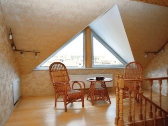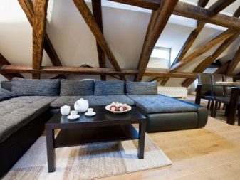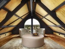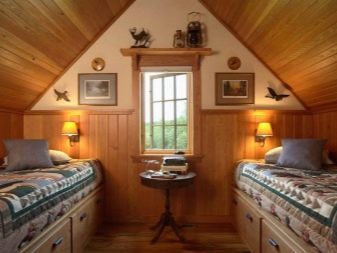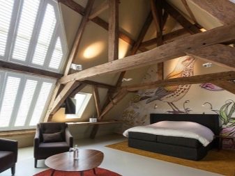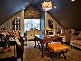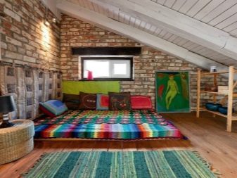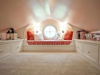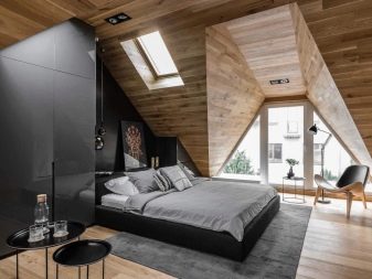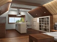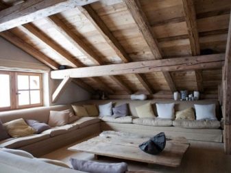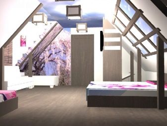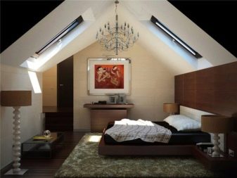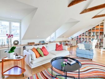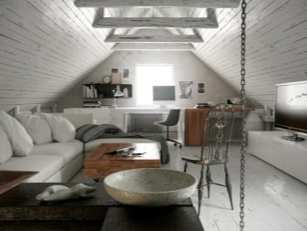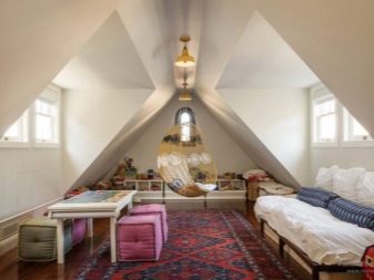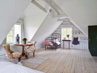 Das oberste Stockwerk eines Landhauses oder eines privaten Hauses ist ein spezifischer Raum mit geometrischen Fehlern, die professionelle Designer zu Vorteilen und einem exklusiven Interieur machen können. Die Decke auf dem Dachboden ist im Prinzip abwesend, aber es gibt gebrochene Balken, einen hohen Bogen und Bögen von verschiedenen Formen und Größen.