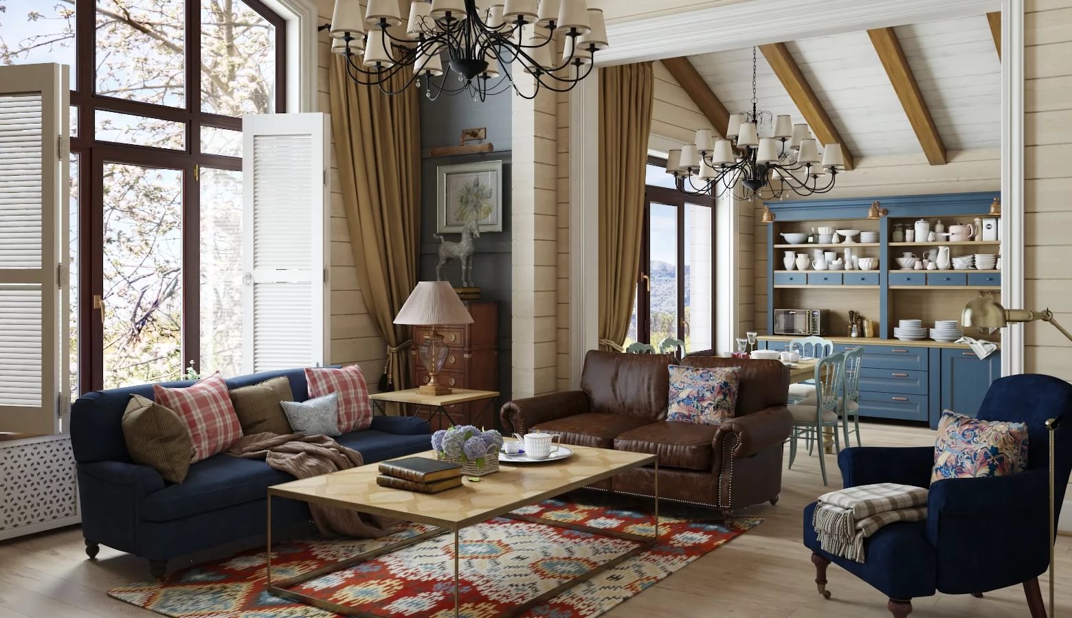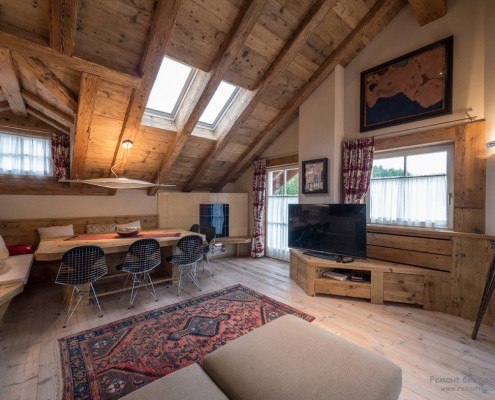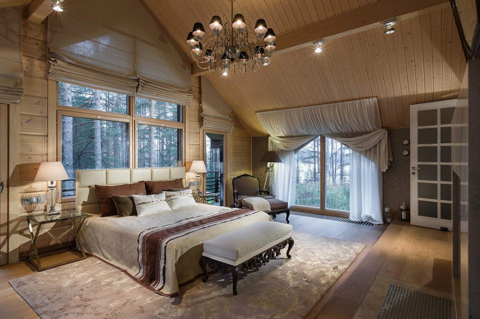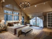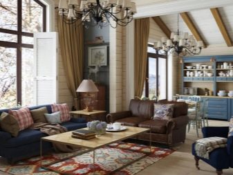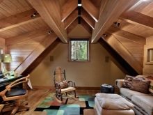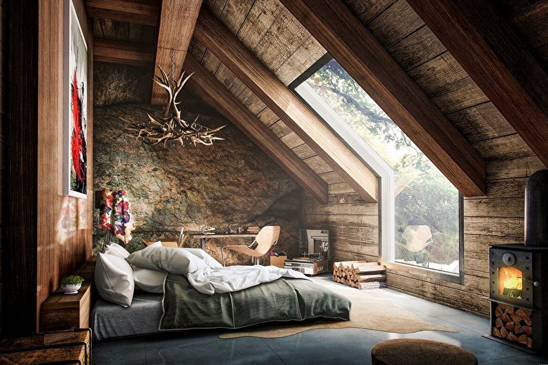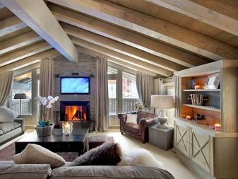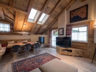- Das Innere des Dachbodenstils Chalet Es ist gut, dass es in einem Raum jeder Größe verwendet werden kann.Diese Richtung des Designs zusammen mit Land passt am besten in den Stil des hölzernen Dachbodens. Im Inneren des Chalets können Sie natürliche Häute, schmiedeeiserne hängenden Kronleuchter mit Imitationskerzen, Teppiche mit Ornamenten und grobe Holzmöbel verwenden.