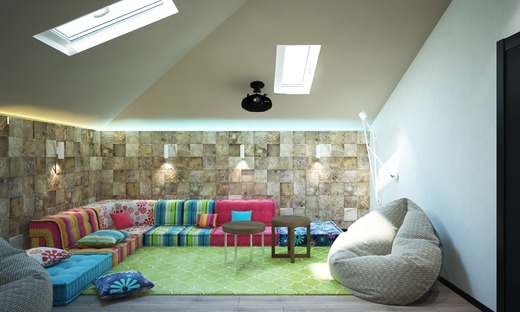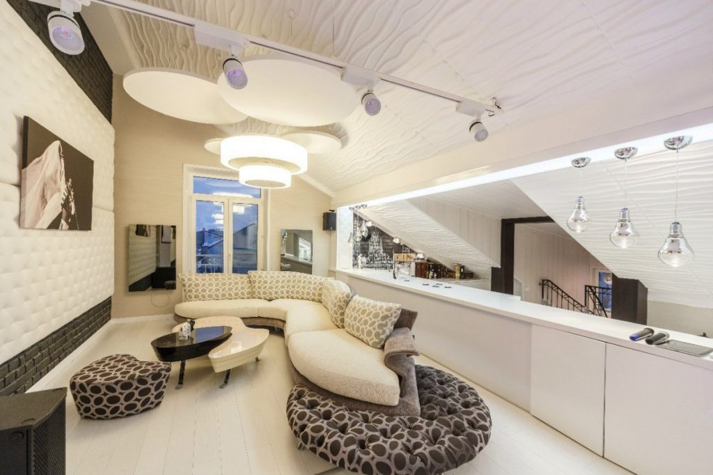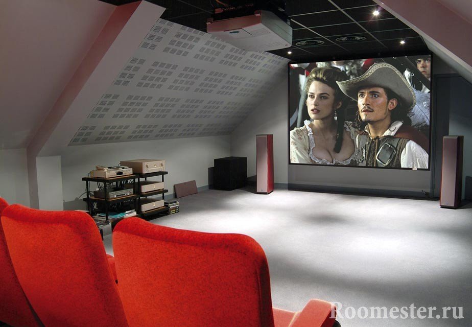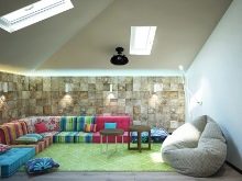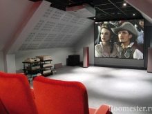 - Kinomans werden sicherlich die Idee haben, einen Dachboden zu einer Heimkino-Halle mit einer Projektionswand, Lautsprechern, geräumigen Sofas und Gästetabellen umzuarbeiten. Die Hauptsache in diesem Raum - im Voraus um die Schalldämmung zu kümmern. Sie können die Atmosphäre mit Mini-Leuchten, die in die Decke eingebaut sind, mit der Möglichkeit von verschiedenen Beleuchtungsmodi, zum Beispiel mit dem Effekt eines Sternenhimmels, angenehmer machen. Sie können auch weiche gepolsterte Hocker oder erschwingliche und sehr bequeme Sitzsäcke als Sitze verwenden. Eine noch viel einfachere Idee ist es, einen dicken, flauschigen Teppich auf den Boden zu legen und viele Kissen darauf zu legen.