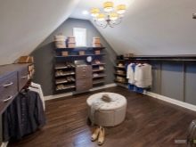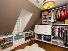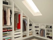 - Garderobe drinnen unter dem Dach spart viel Speicherplatz in Ihrem Zuhause. Schließlich können Sie selbst auf dem Dachboden der einfachsten Größe eingebaute oder autonome Aufbewahrungssysteme installieren, die Kleidung und Schuhe für alle Familienmitglieder leicht aufnehmen können.