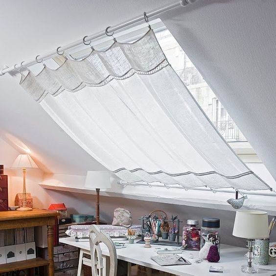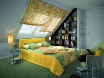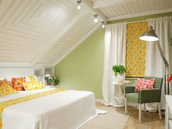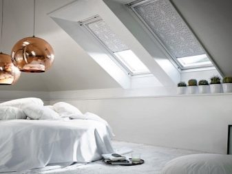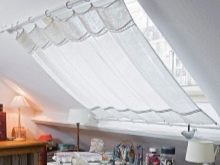 Was die Dekoration der Fenster des Dachgeschosses betrifft, können Sie nicht nur klassische Vorhänge, sondern auch praktische Rollläden (innen oder außen), Jalousien, Markisen oder alle Arten von Verkleidungen verwenden. Für geneigte Konstruktionen sind optimal zu pflegende und einfach zu montierende Jalousien ideal. In der heißen Jahreszeit können sie einen Schatten im Raum schaffen, der sie vor den Sonnenstrahlen schützt und gleichzeitig die frische Luft nicht blockiert. Wenn Sie klassische Vorhänge bevorzugen, achten Sie auf spezielle Designs mit Befestigungselementen und Streben, die dazu beitragen, die Vorhänge an einem schrägen Fenster zu halten.