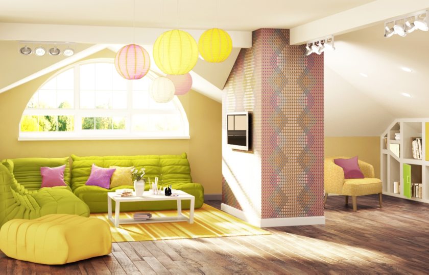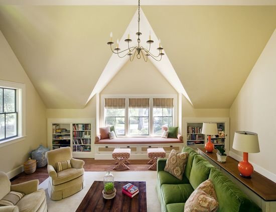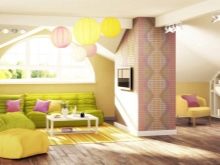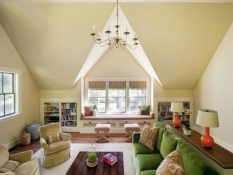 Farbenfrohe Möbel werden den Innenraum beleben, Glas- und Spiegelflächen, Metallbeschläge und originelle Beleuchtung tragen mit Leichtigkeit zum Wohnzimmer bei. Um das Wohnzimmer war gut beleuchtet, können Sie das Fenster auf den Dachschrägen nutzen. Ein Kamin oder seine Nachahmung wird den Raum noch komfortabler machen.