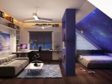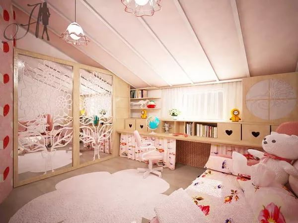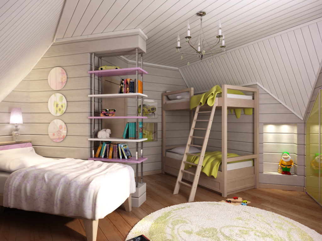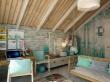 - Wenn Sie ein Kind unter dem Dach anordnen, verwenden Sie helle Farbtöne und bevorzugen Sie waschbare Tapeten. Nachdem Sie ein Loft für ein Kind entworfen haben, werden Sie sicherlich seinen Kindheitstraum über Ihr Haus und Ihren persönlichen Raum erfüllen, in dem Zauberinnen und andere Märchengeschöpfe nachts einkehren können. Auf dem Dachboden wird das Kind Frieden für sich und seine Freunde erhalten, während die Erwachsenen nicht durch Spielsachen, Filzstifte und Kleidung gestört werden, die im ganzen Haus verteilt sind. Wenn es die Decken zulassen, ein Etagenbett in der Mitte einbauen und einen Sportplatz mit Trainingsgeräten unter den Dachschrägen ausstatten.