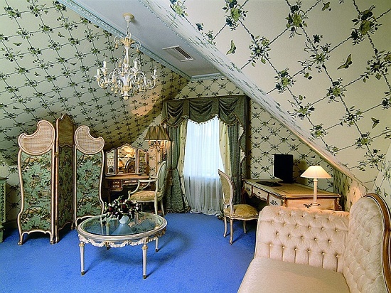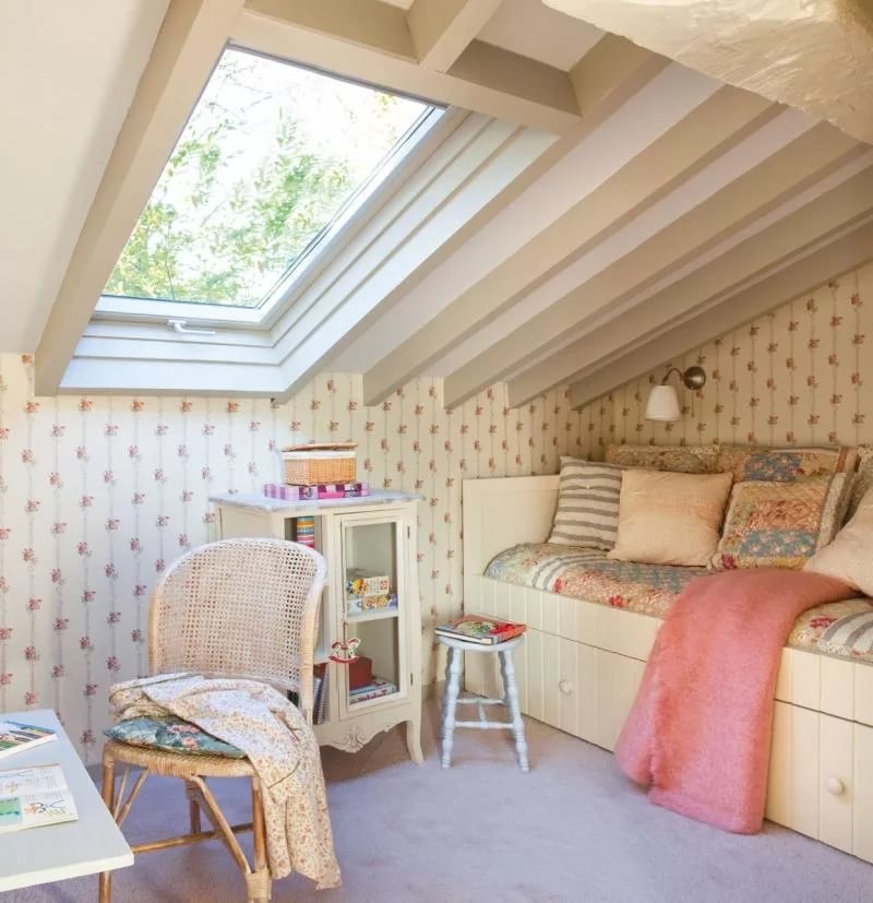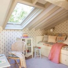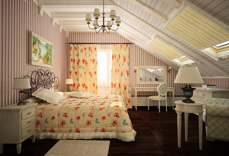 - Wenn du übst romantische Richtung Verwenden Sie im Design die Methode zum Einfügen von Tapeten mit einem floralen Thema. Tücher mit einem leichten Schatten mit einem sanften und mittelgroßen Muster helfen, die Wirkung von "Sarg" zu erzielen, und Ihr Dachzimmer wird dem Inneren eines magischen Palastes ähneln. Eine interessante Idee wäre, die Balken an der Decke in einer dunklen Farbe zu streichen und den Rest und die Wände weiß zu lassen. Dekorieren Möbel in Decoupage-Technik wird in diesem Stil besonders beeindruckend. Textilien spielen hier eine wichtige Rolle: gestrickte oder handgemachte Teppiche, Kissen, Umhänge, Bettdecken und andere Haushaltsgegenstände.