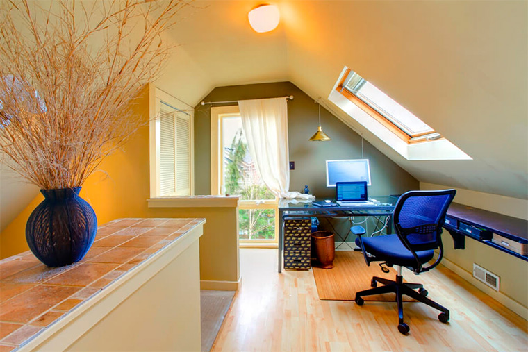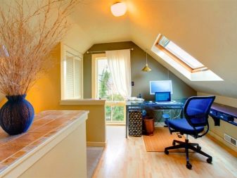 - Die Abgeschiedenheit des Dachbodens vom Rest des Hauses und gute Schalldämmung wird hier helfen, einen Arbeitsplatz oder ein Büro zu organisieren. Ruhige Atmosphäre wird zur Arbeit beitragen. In der Studie besteht die Hauptaufgabe darin, über zusätzliche Beleuchtung nachzudenken. Es ist auch eine gute Idee, eine Mini-Bibliothek zu organisieren, wo Sie Ihre Abende lesen Bücher, einen Workshop oder einen anderen Ort für produktive Arbeit und Kreativität verbringen können. Verwenden Sie in einem solchen Raum den maximalen Platz unter den Fasen für die Organisation von Lagersystemen und Regalen.