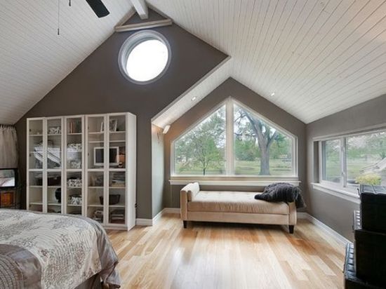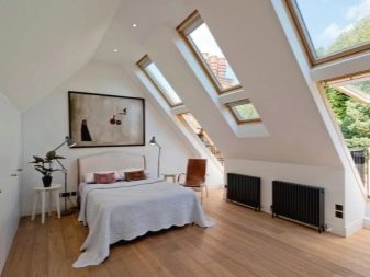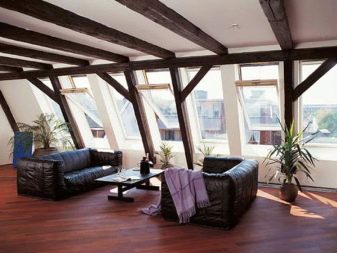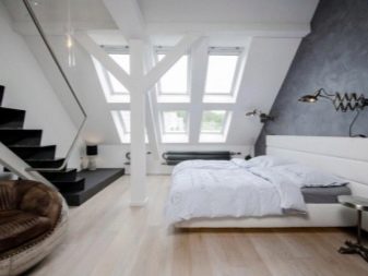 Dachfenster können sowohl um den Raum herum als auch an den Dachneigungen angeordnet sein. Gleichzeitig kann ihre Konfiguration nicht nur rechteckig, sondern auch rund oder polygonal sein - hier lassen sich Architekten und Designer mit Formen experimentieren. Der originellste und effektivste Empfang im Inneren ist die Anordnung eines großen Panoramafensters in der gesamten Wand. und bewundern Sie die Landschaft, Sonnenuntergänge und Sonnenaufgänge.Wenn finanzielle Möglichkeiten organisiert werden können und das Fenster, das einen Mechanismus hat, verwandelt es in einen Mini-Balkon mit einem Schuppen und Geländer. Die ursprüngliche Design-Technik wird sein, um das Fenster zahlreiche Rahmen mit Fotografien oder Gemälden zu platzieren.