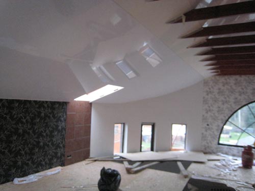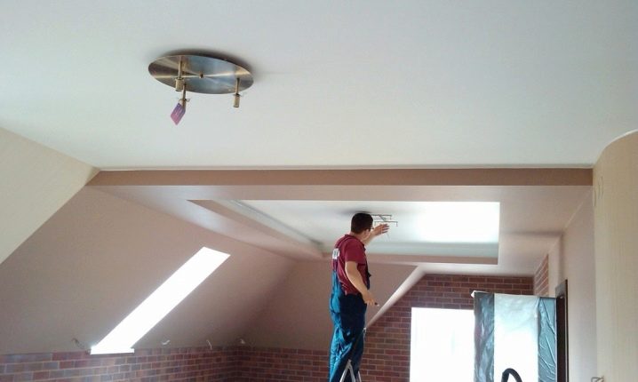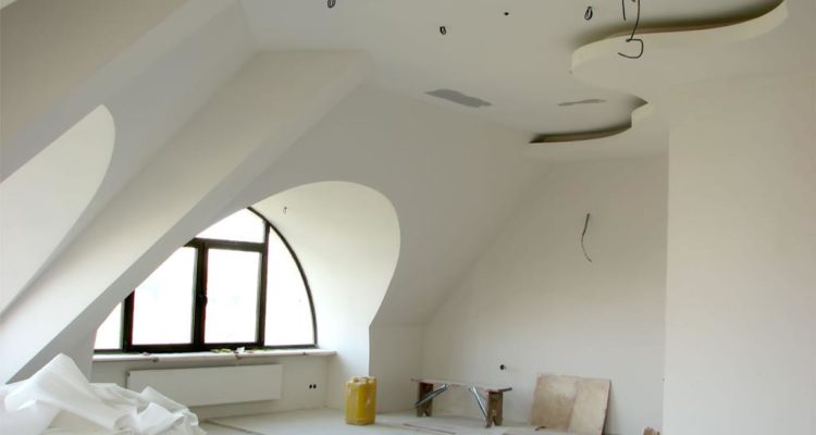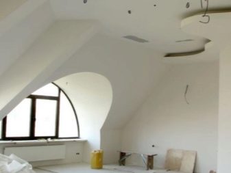 Decken mit Höhenunterschieden und komplexe geometrische Figuren aus Gipskarton für die Gestaltung des Dachgeschosses werden von Anhängern des modernen Designs gewählt. Damit Ihnen eine solche Decke jahrelang treu bleibt und vor Auslaufen geschützt ist, ist es besser, feuchtigkeitsdichte Trockenbauplatten zu wählen. Vergessen Sie nicht die Dachabdichtung, damit die Decke der Gipsplatte bei Regen nicht beschädigt wird.