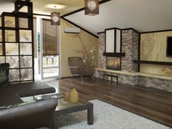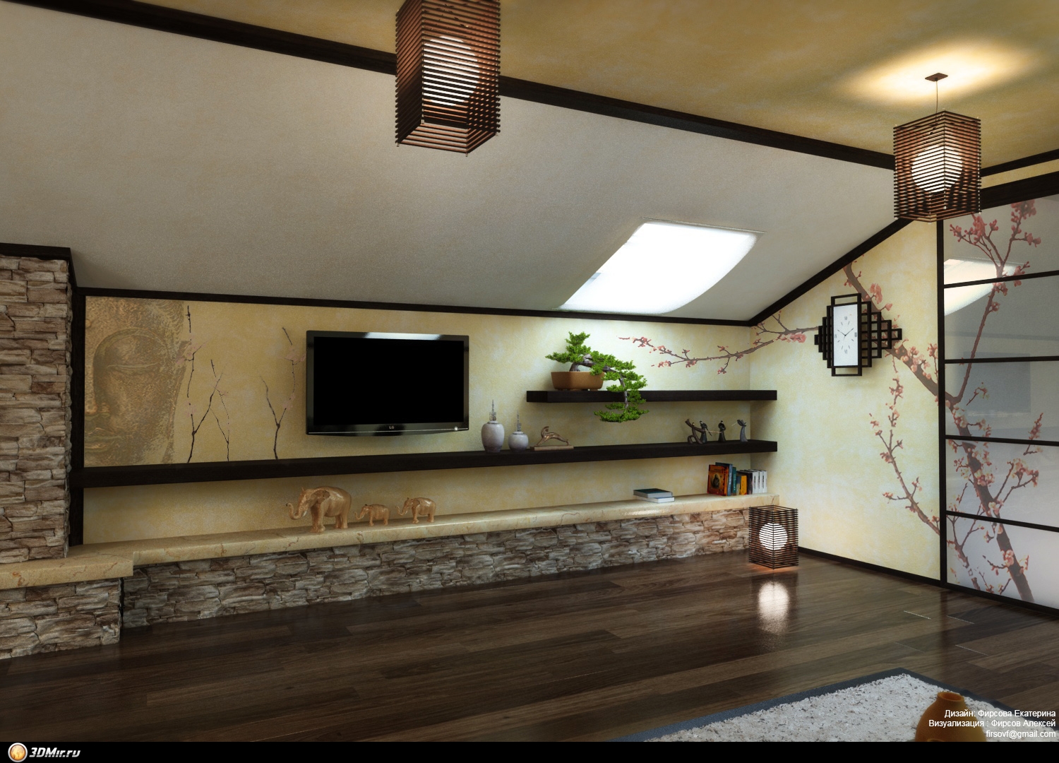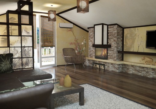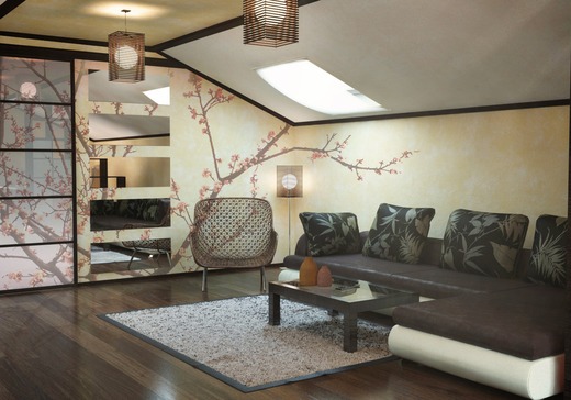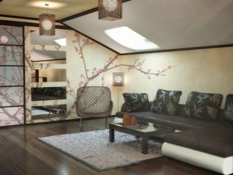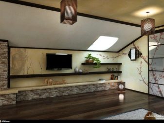 - die japanischer Stil Attic zeichnet Liebhaber von Minimalismus und klaren Linien. Die überprüften geometrischen Linien des Raumes unter dem Dach ergänzen das Minimum der Möbel von prägnantem Design und Formen. Das Design verwendet hier ein Minimum an Zubehör, und der Hauptbeton des Designs sind kontrastierende Schattierungen im Inneren, zum Beispiel eine Kombination aus beigen Wänden mit dunkelbrauner Bodentextur und Balken. Die Philosophie dieses Stils ist "nichts überflüssiges", also kann man in so einem Dachboden gemütlich mit einer Tasse Tee entspannen.