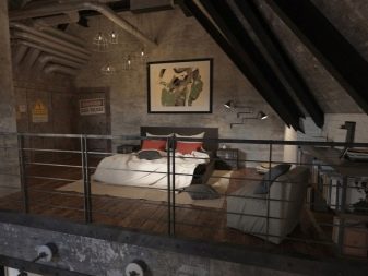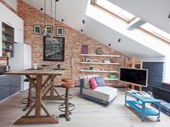Und fügen Sie im Dachgeschoss Innenleuchten und ein künstlerisches Element wie Gemälde in Form von Werbetafeln hinzu. Auch zeichnet sich der Stil durch Freiraum, das Fehlen von Trennwänden und die Kombination von scheinbar inkompatiblen Materialien aus. Natürlich wird ein solches mehrdeutiges Interieur in der Regel von kreativen Menschen gewählt, die im Alltag unprätentiös sind und für die Konventionen keine Rolle spielen.
