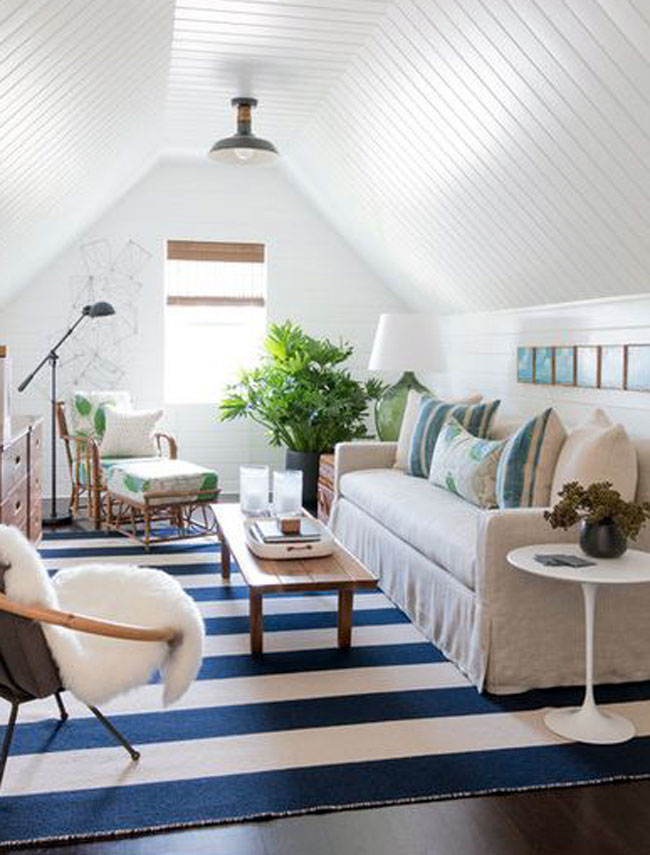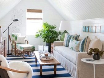 - Für Liebhaber der Reise und der südlichen Sonne schlagen wir vor, einen Dachboden zu Ihrer "See" gemütlichen Ecke zu machen Mediterraner Stil in der Innenarchitektur, deren Grundlage die Wände von gesättigten Blau-, Blau- und Sandtönen sind. Nachdem Sie Seezubehör und Souvenirs aus der Reise hinzugefügt haben, geben Sie einen sehr gemütlichen und ungewöhnlichen Raum unter dem Dach aus.Entlang des Dachbodens befinden sich Stühle, Stühle oder Korbmöbel.