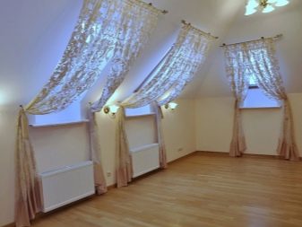 Da das Dachzimmer in der Regel klein ist, sollten Sie es mit dunklen Textilien an den Fenstern nicht optisch noch kleiner machen. Aber Pastelltöne - das ist, was Sie brauchen, um eine einfache und entspannte Atmosphäre der Ruhe auf dem Dachboden zu schaffen. Klassisch und eine Win-Win-Option im Innenraum - transparente Vorhänge, die genügend Licht einlassen und gleichzeitig dem Raum zusätzlichen Komfort verleihen.