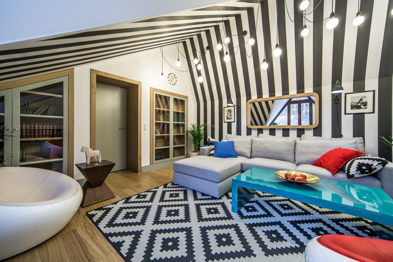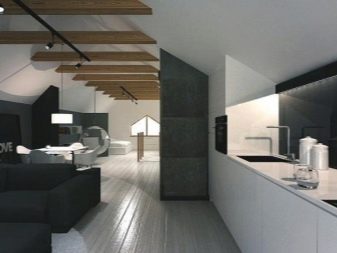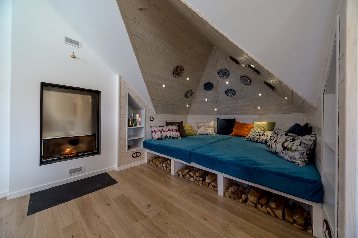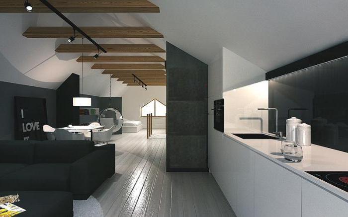 In modernen Häusern wählen die Eigentümer in der Regel die Kombination von Zonen, machen eine großzügige freie Anordnung und kombinieren das Wohnzimmer mit Küche und Esszimmer. Da der Dachboden nicht sehr viel Platz hat, ist es die richtige Zoneneinteilung, die ihn so frei wie möglich macht. Zu diesem Zweck werden bei der Veredelung Designtechniken verwendet (z. B. das Hervorheben einer Wand in der Mitte mit einer bestimmten Farbe), das Experimentieren mit Beleuchtung, das Bemalen von Holzbalken in Weiß oder das Bestrahlen von möglichst vielen reflektierenden Flächen im Inneren.