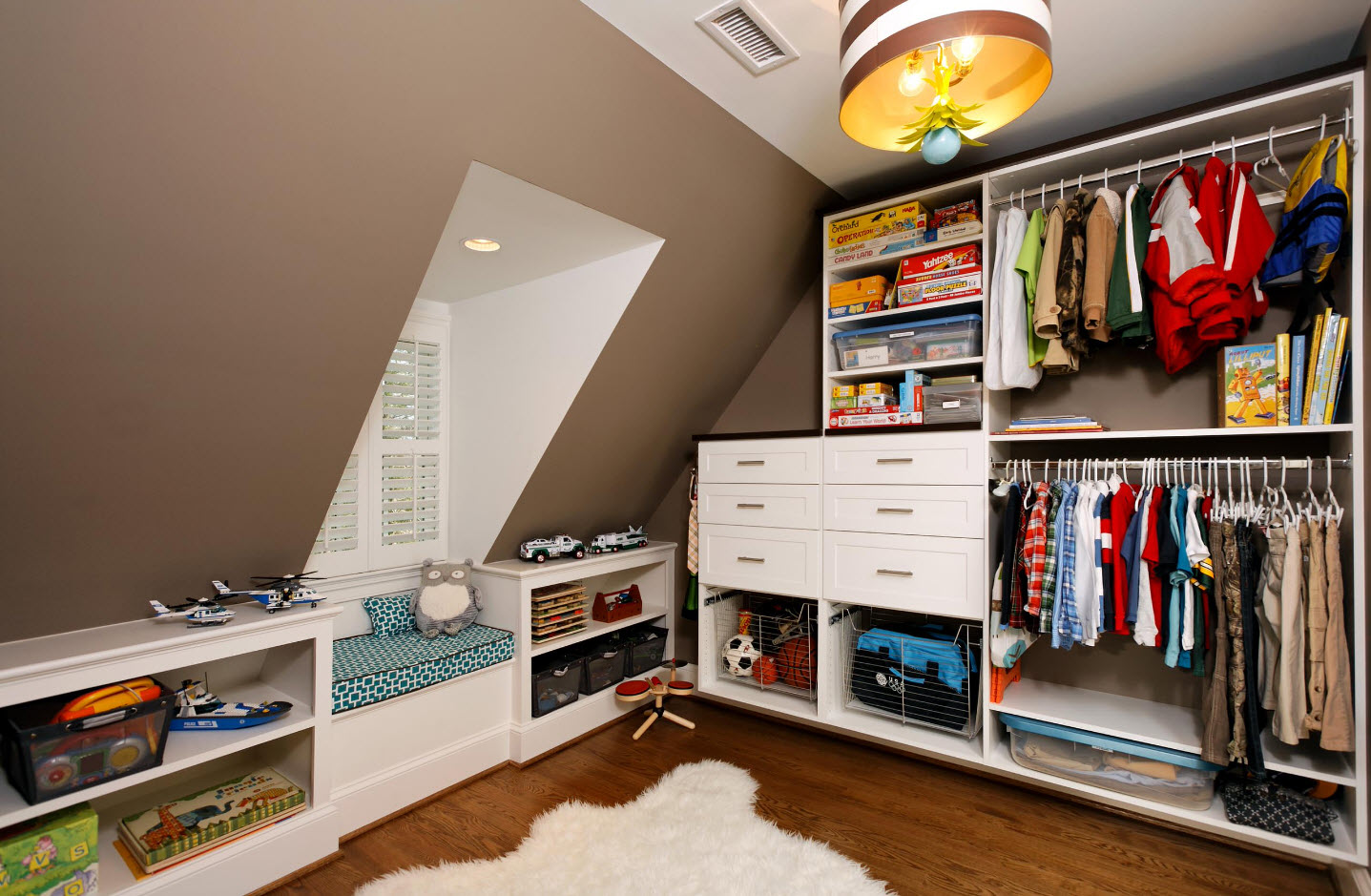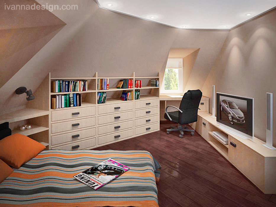 Da das Dachzimmer normalerweise klein ist, kümmern sich um rationale Anordnung der DingeZum Beispiel in Schlafstätten ist es besser, über eingebaute Schränke und Regale nachzudenken. Sie können hier auch einen Ankleidebereich um die Vordertür in Form von Schränken vom Boden bis zur Decke anbringen, was viel Platz spart.