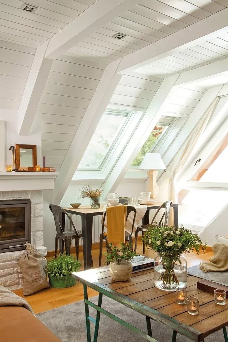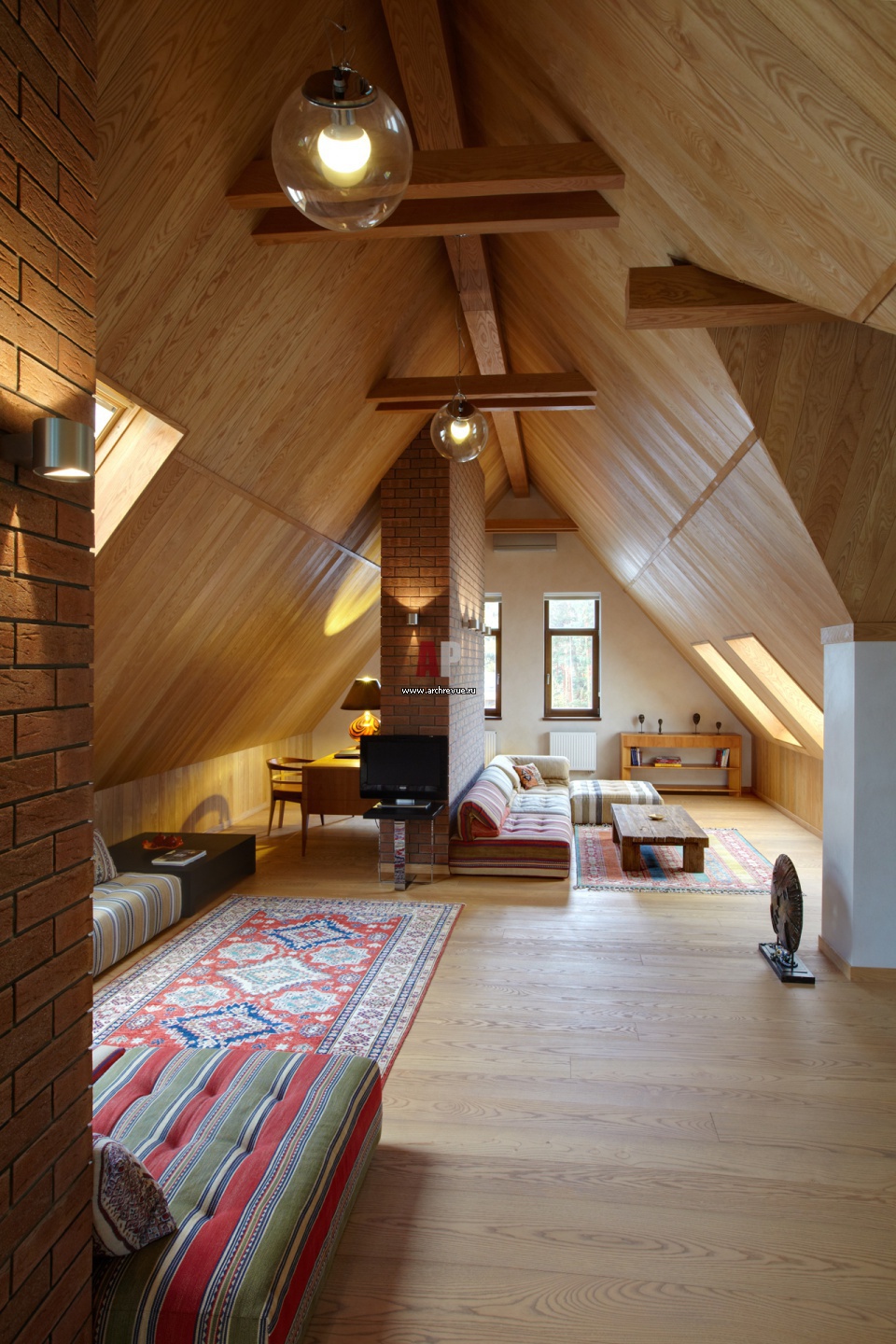 - Wenn Sie auf dem Dachboden Wohnzimmer oder Aufenthaltsraum zu organisieren planen, können Sie das Zimmer in Landhausstil arrangieren, und passen in die Innenarchitektur von Holzwänden und Balken. Dieses Finish ist nicht nur umweltfreundlich und sicher, sondern auch gesundheitsfördernd, Dank dem heilenden Aroma, das Nadelbäume ausstrahlen. Auch der Baum - ein ausgezeichneter Schallisolator, so dass der Klang von Regentropfen auf dem Dach wird wahrscheinlich nicht schaden.Darüber hinaus "atmen" die Holzwände und die Decke und geben dem Dachboden maximalen Komfort und Wärme. Und wenn Sie mehr Licht und Raum wünschen, dann wählen Sie ein Wohnzimmer in schneeweißen Tönen, in denen niemand den ehemaligen Dachboden kennt.