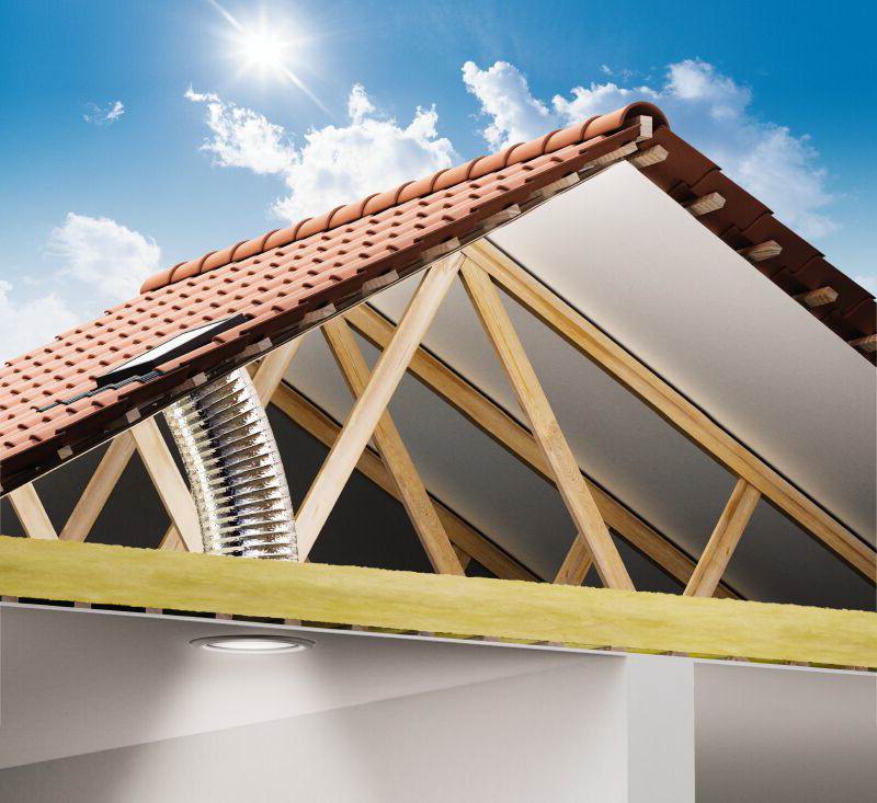 In Übereinstimmung mit den Konstruktionsmerkmalen des Dachbodens gibt es Fälle, in denen es unmöglich ist, ein vollständiges Fenster zu organisieren - dann benützen Sie die Rezeption "Lichttunnel"wenn das Sonnenlicht durch eine Röhre mit der Fähigkeit der Reflexion hindurchgeht. Dieser Entwurf kann diffuses Sonnenlicht teilen und in einem kleinen Dachbodenraum bis 10 Quadratmeter benutzt werden. m