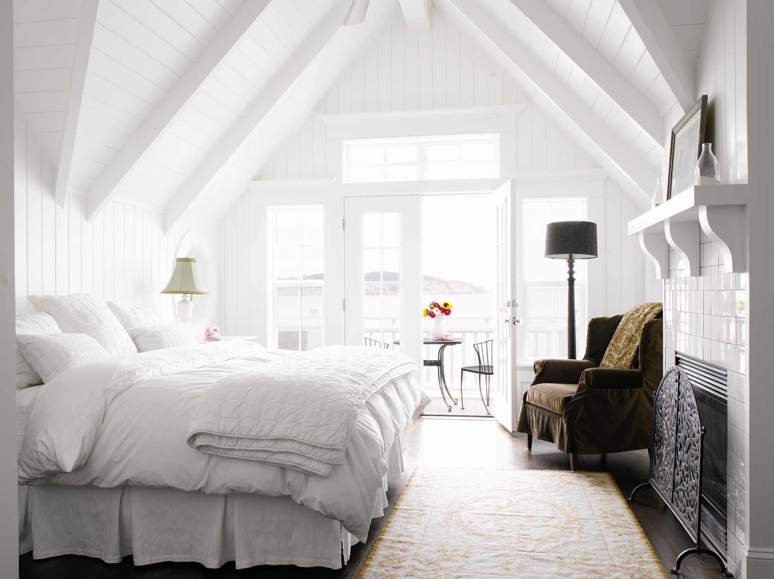 Was die Farblösung im Design des Schlafzimmers im Dachgeschoss betrifft, wäre die einfachste und effektivste Option, die Wände weiß zu streichen. Hell glänzende Oberflächen sind dafür bekannt, dass sie Licht reflektieren.Da der Dachboden normalerweise schlecht beleuchtet ist, wird das helle Ende dem Raum Licht und Raum hinzufügen. "Die dunkle Unterseite und die weiße Spitze" dienen auch als eine visuelle Zunahme des Raumes, also können Sie natürliche dunkle Holzfußböden und weiße Wände mit einer Decke verwenden. Sieht eindrucksvoll aus und imitiert Deckenbalken, die zum Bodenbelag passen.